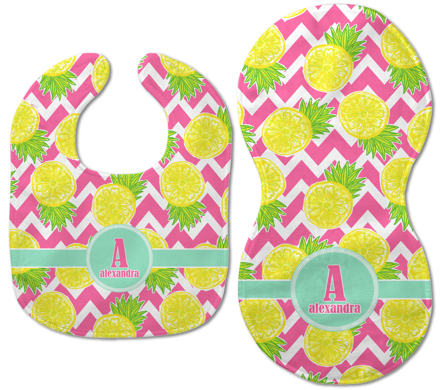 The main design has a background with bright pink and white chevron with some crazy yellow and lime pineapple slices scattered on top. A soft mint color is used for the ribbon and label, while a pink is used for the personalized name and initial.