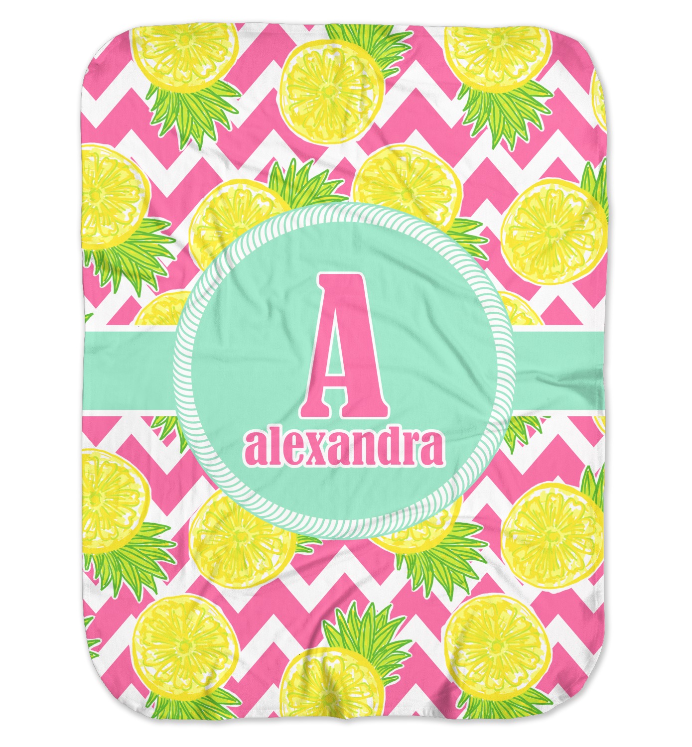 The main design has a background with bright pink and white chevron with some crazy yellow and lime pineapple slices scattered on top. A soft mint color is used for the ribbon and label, while a pink is used for the personalized name and initial.