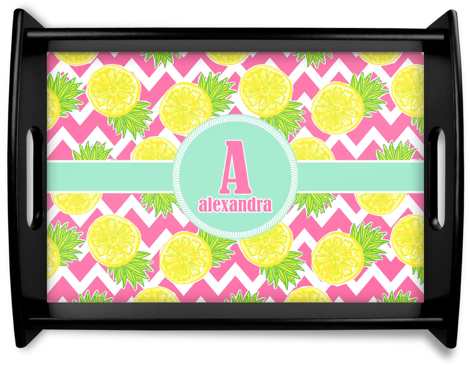 The main design has a background with bright pink and white chevron with some crazy yellow and lime pineapple slices scattered on top. A soft mint color is used for the ribbon and label, while a pink is used for the personalized name and initial.