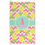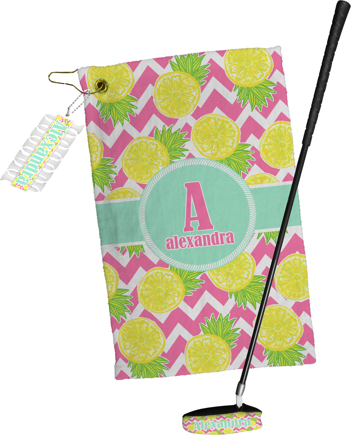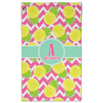 The main design has a background with bright pink and white chevron with some crazy yellow and lime pineapple slices scattered on top. A soft mint color is used for the ribbon and label, while a pink is used for the personalized name and initial.