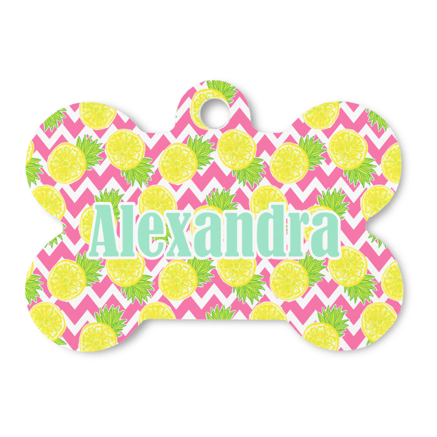 The main design has a background with bright pink and white chevron with some crazy yellow and lime pineapple slices scattered on top. A soft mint color is used for the ribbon and label, while a pink is used for the personalized name and initial.