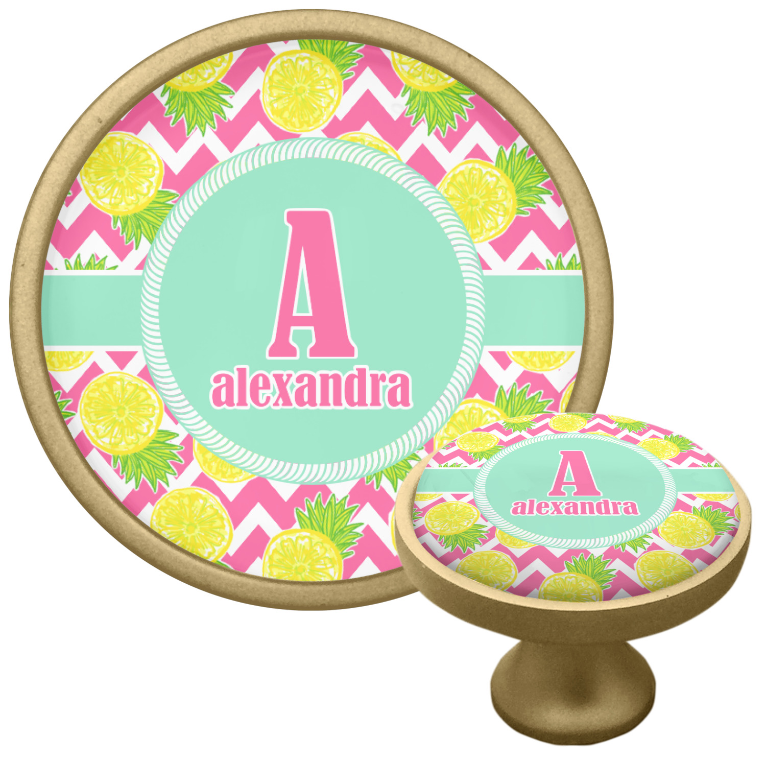 The main design has a background with bright pink and white chevron with some crazy yellow and lime pineapple slices scattered on top. A soft mint color is used for the ribbon and label, while a pink is used for the personalized name and initial.