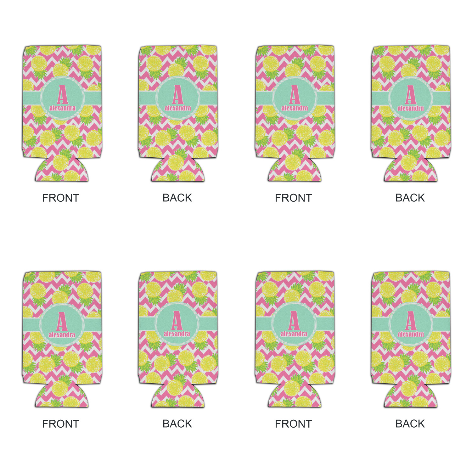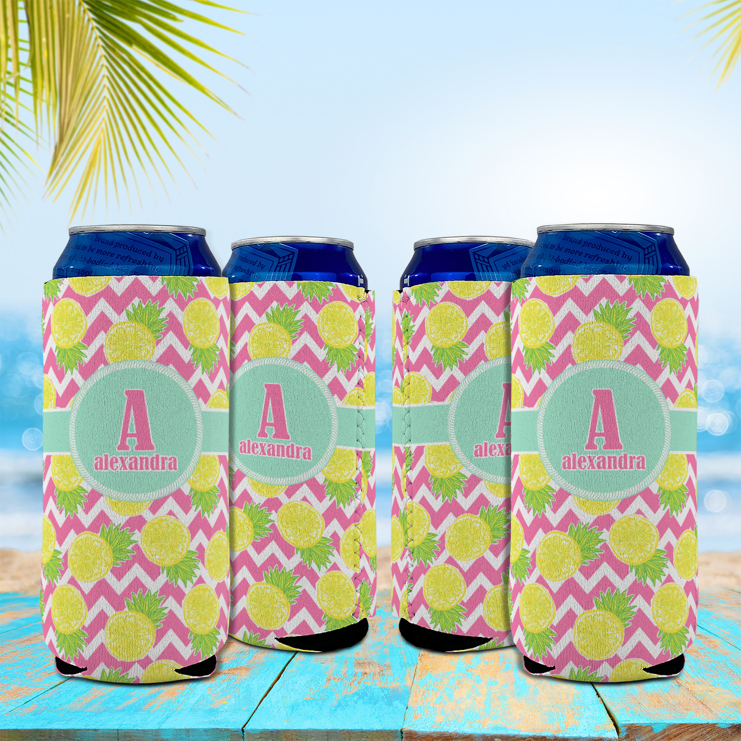 The main design has a background with bright pink and white chevron with some crazy yellow and lime pineapple slices scattered on top. A soft mint color is used for the ribbon and label, while a pink is used for the personalized name and initial.