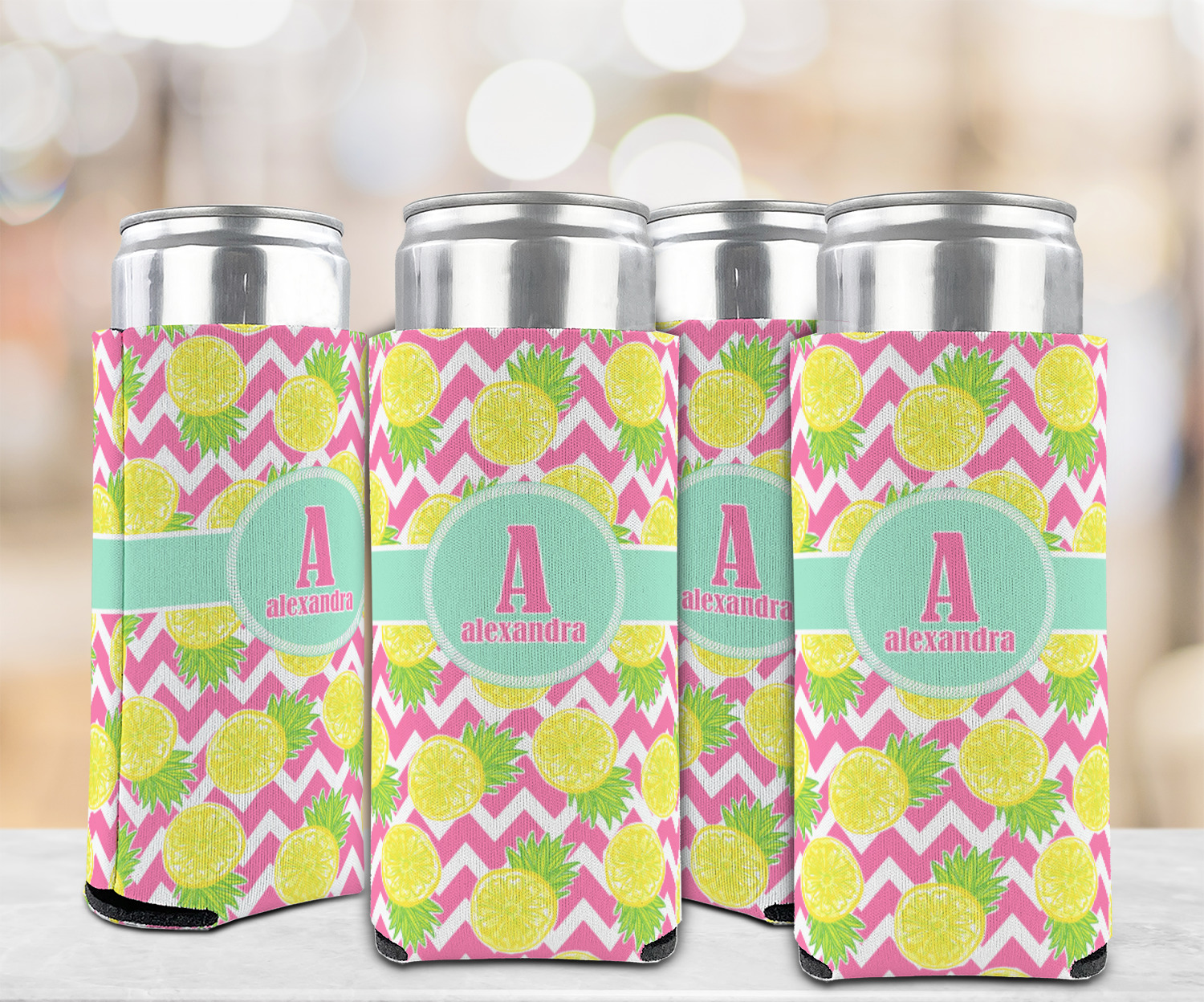 The main design has a background with bright pink and white chevron with some crazy yellow and lime pineapple slices scattered on top. A soft mint color is used for the ribbon and label, while a pink is used for the personalized name and initial.