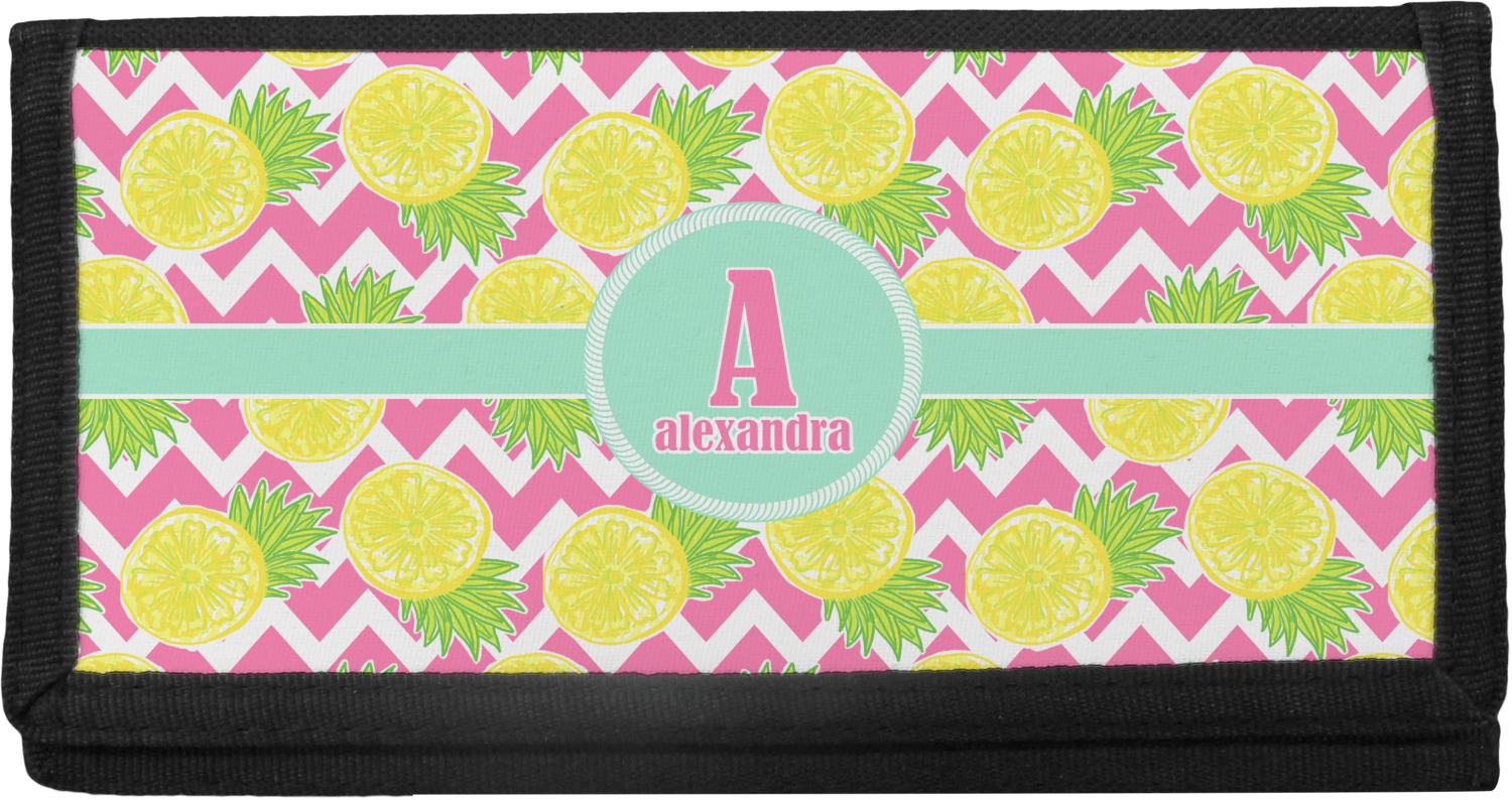 The main design has a background with bright pink and white chevron with some crazy yellow and lime pineapple slices scattered on top. A soft mint color is used for the ribbon and label, while a pink is used for the personalized name and initial.