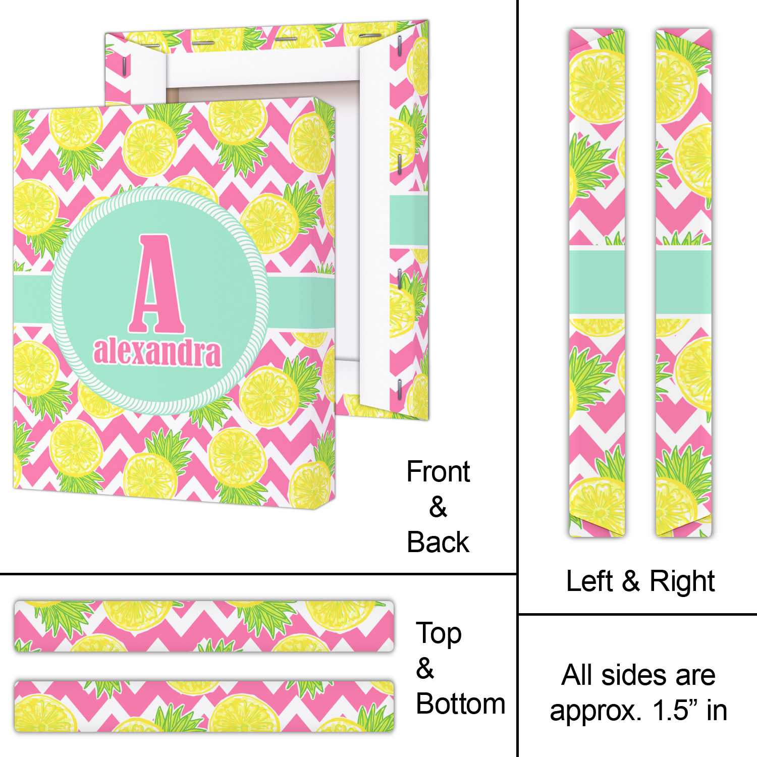 The main design has a background with bright pink and white chevron with some crazy yellow and lime pineapple slices scattered on top. A soft mint color is used for the ribbon and label, while a pink is used for the personalized name and initial.