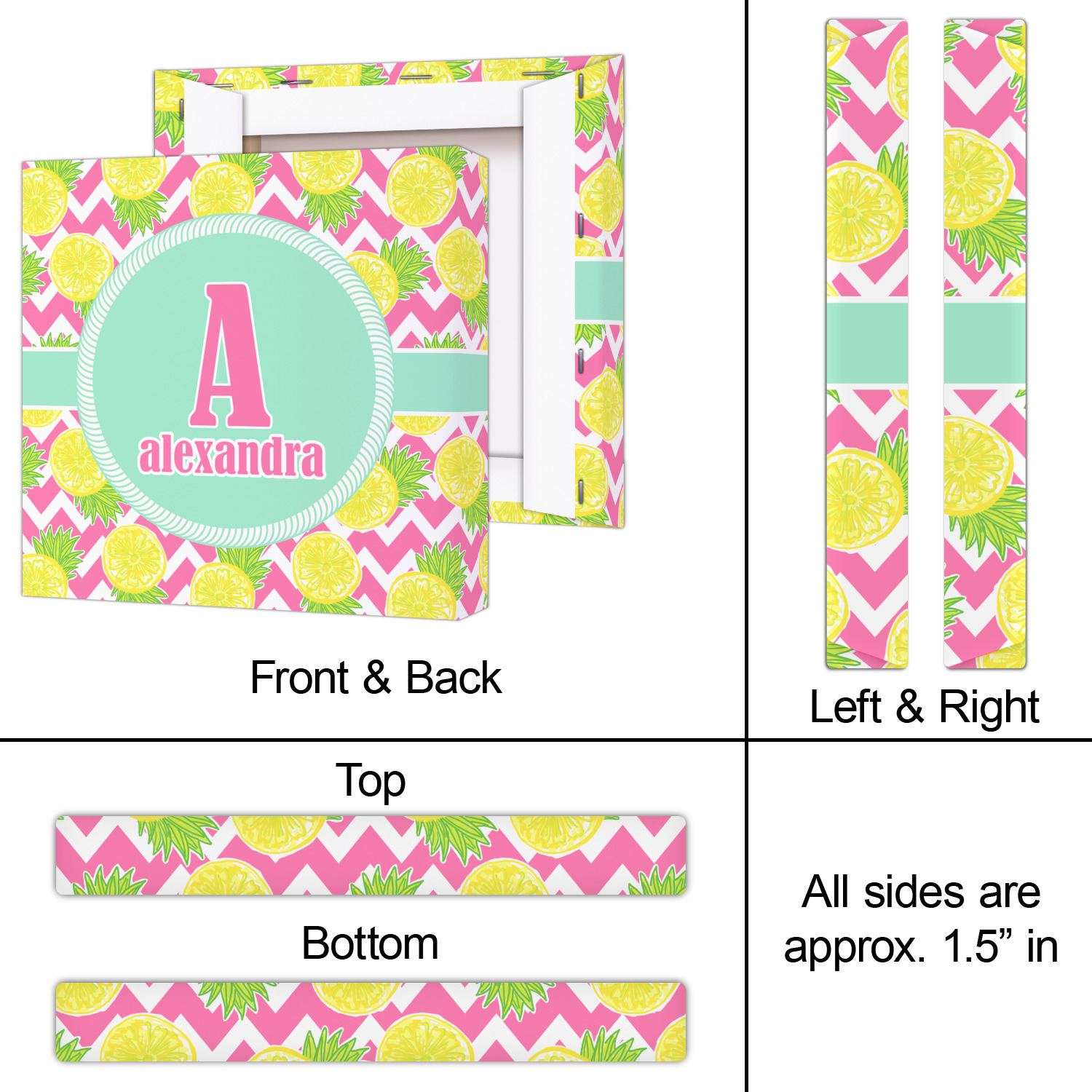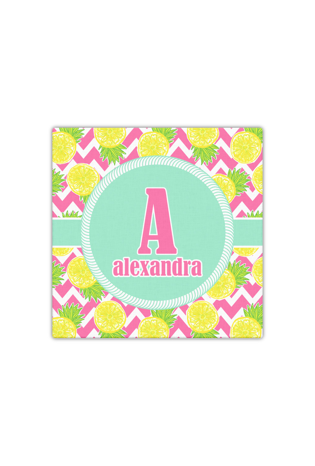 The main design has a background with bright pink and white chevron with some crazy yellow and lime pineapple slices scattered on top. A soft mint color is used for the ribbon and label, while a pink is used for the personalized name and initial.