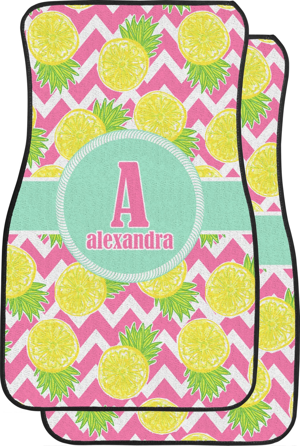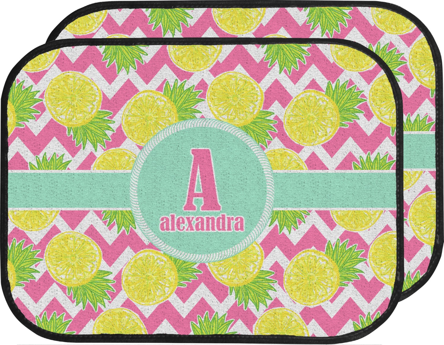 The main design has a background with bright pink and white chevron with some crazy yellow and lime pineapple slices scattered on top. A soft mint color is used for the ribbon and label, while a pink is used for the personalized name and initial.
