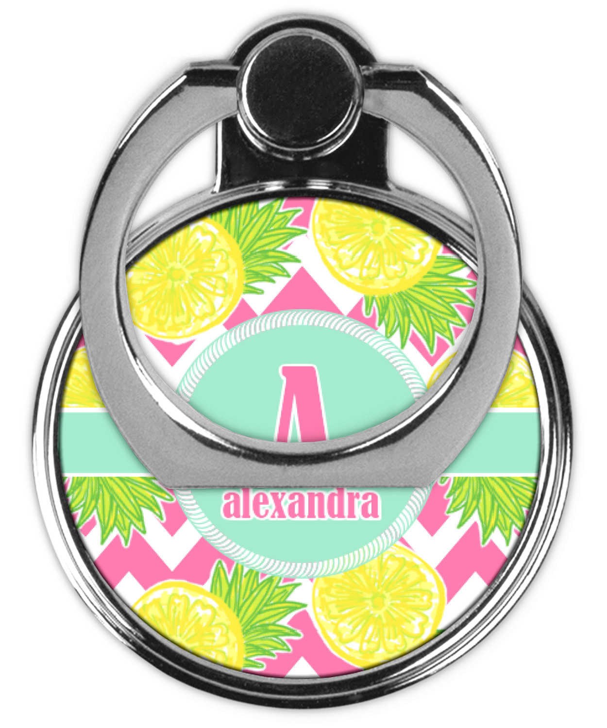The main design has a background with bright pink and white chevron with some crazy yellow and lime pineapple slices scattered on top. A soft mint color is used for the ribbon and label, while a pink is used for the personalized name and initial.