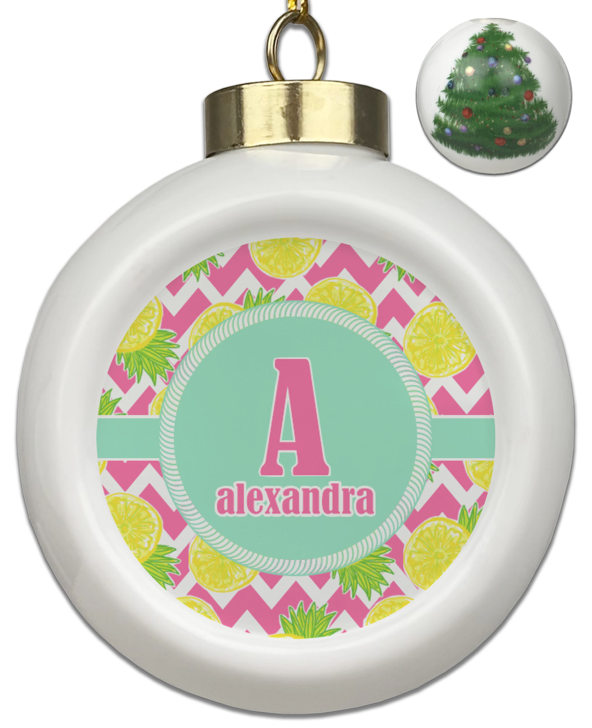 The main design has a background with bright pink and white chevron with some crazy yellow and lime pineapple slices scattered on top. A soft mint color is used for the ribbon and label, while a pink is used for the personalized name and initial.