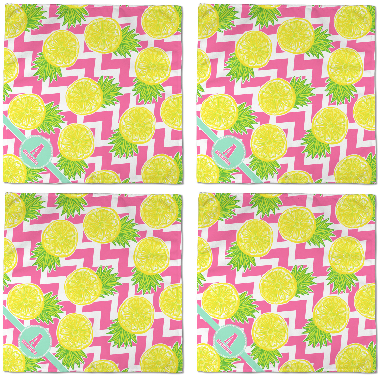 The main design has a background with bright pink and white chevron with some crazy yellow and lime pineapple slices scattered on top. A soft mint color is used for the ribbon and label, while a pink is used for the personalized name and initial.