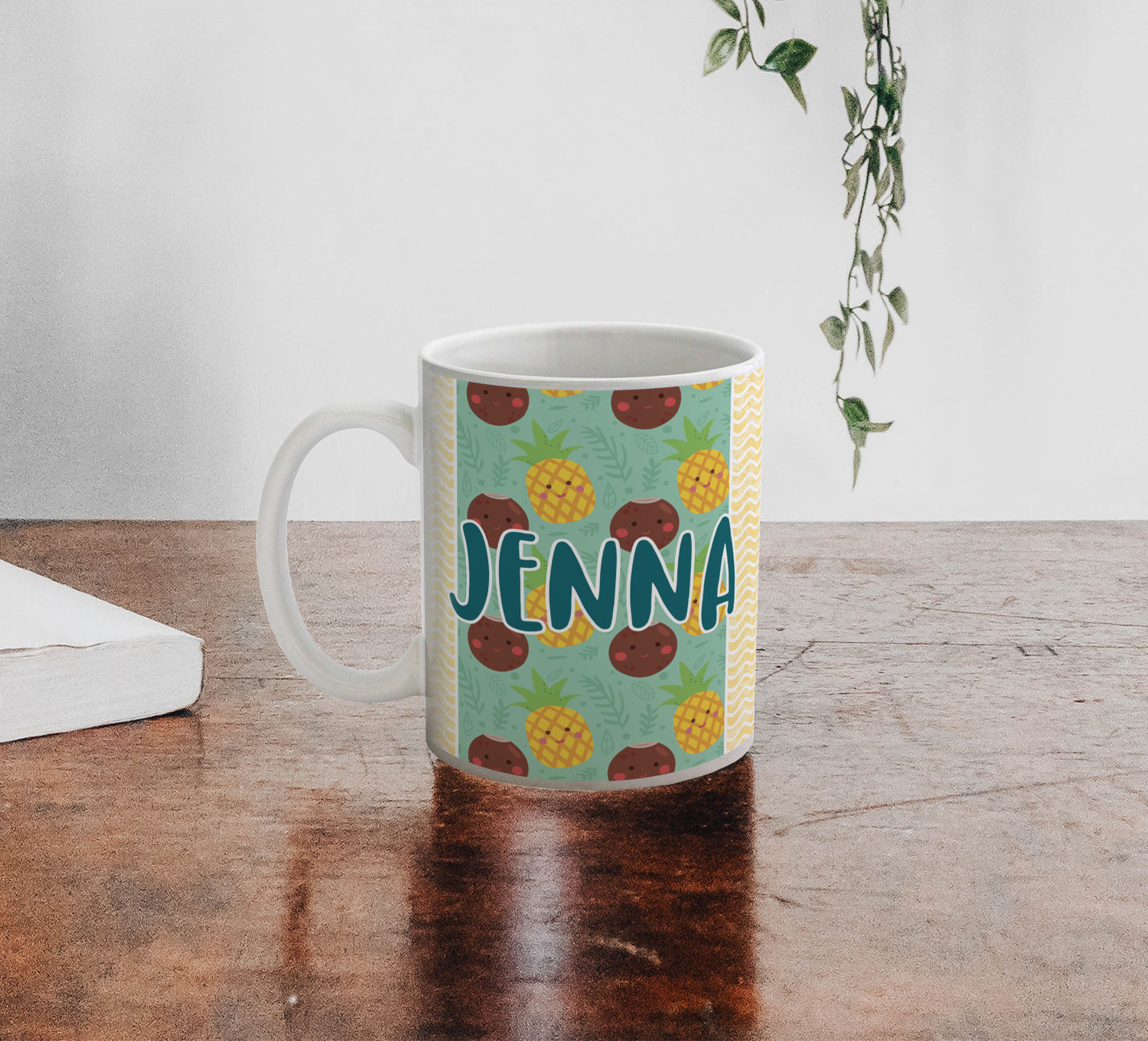 This design is filled with happy coconuts and pineapples to brighten your day. A nice teal color is used behind them, while a yellow chevron is used as the secondary pattern.