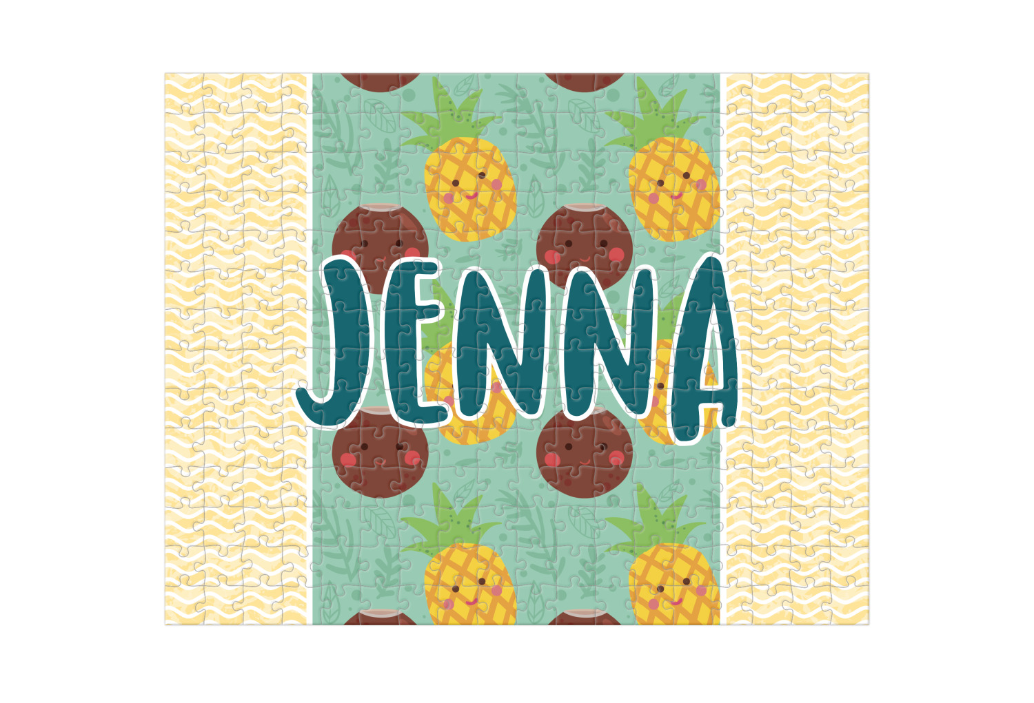 This design is filled with happy coconuts and pineapples to brighten your day. A nice teal color is used behind them, while a yellow chevron is used as the secondary pattern.