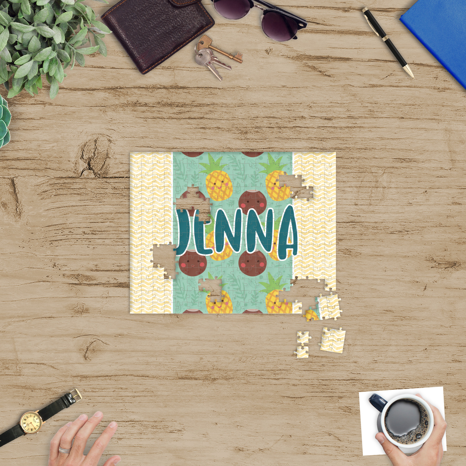 Depending on the look you are trying to achieve, you can add; a thematic pattern or background, with a photo in a frame and text or personalization to your puzzle. Basically if you can imagine it, you can design it!