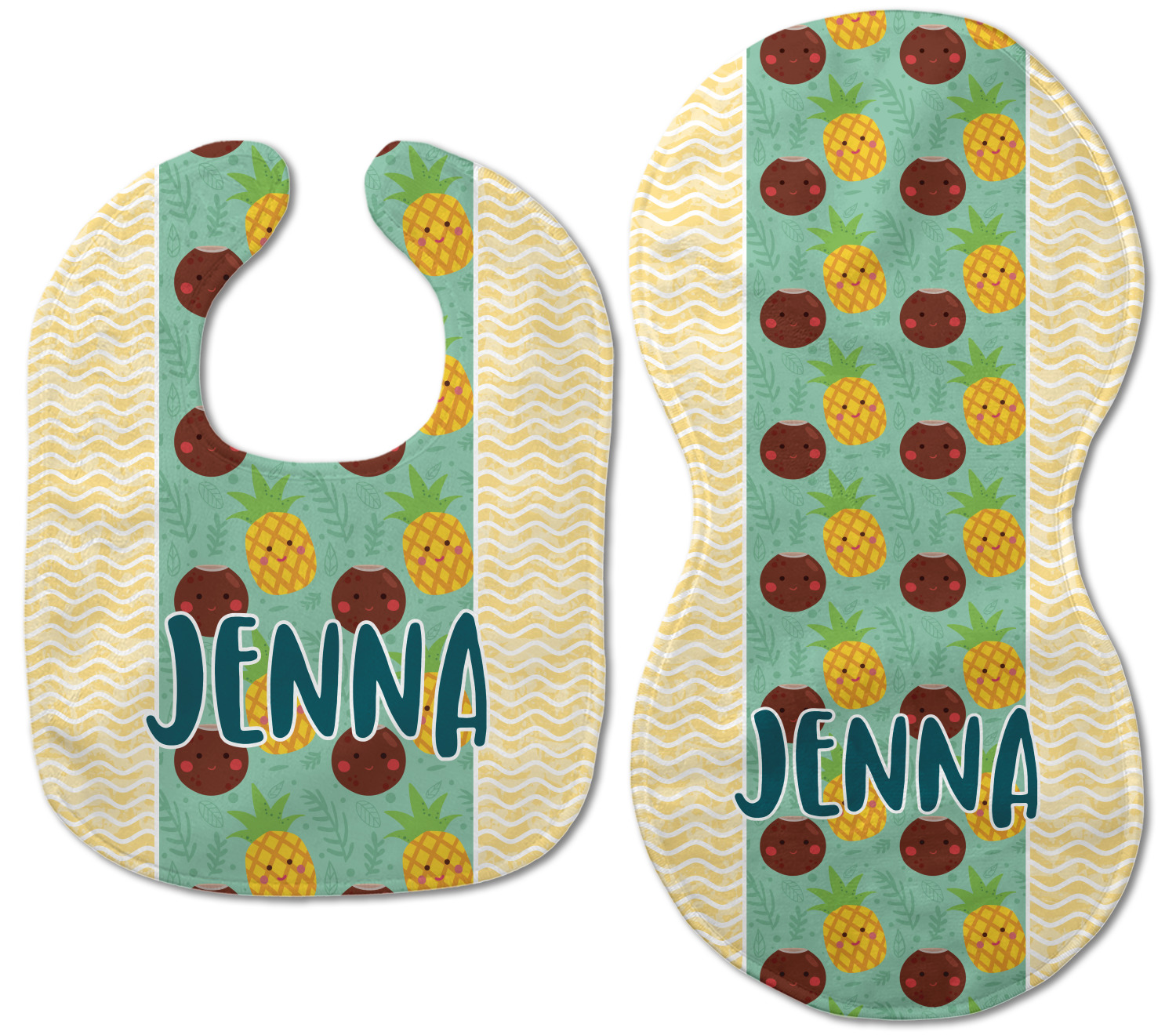 This design is filled with happy coconuts and pineapples to brighten your day. A nice teal color is used behind them, while a yellow chevron is used as the secondary pattern.