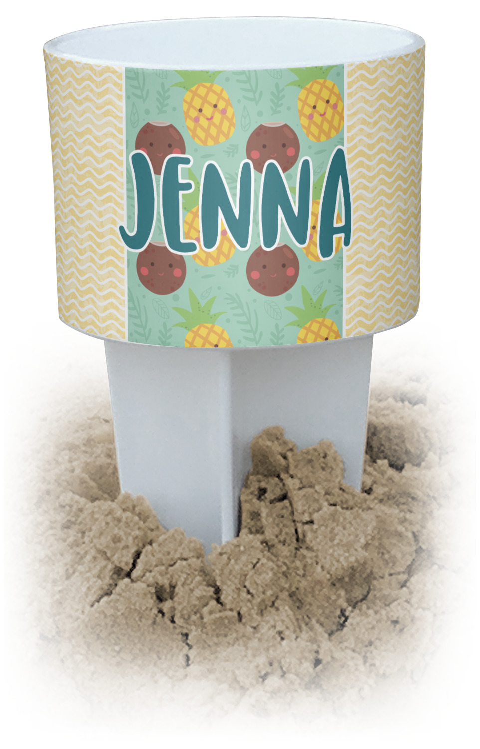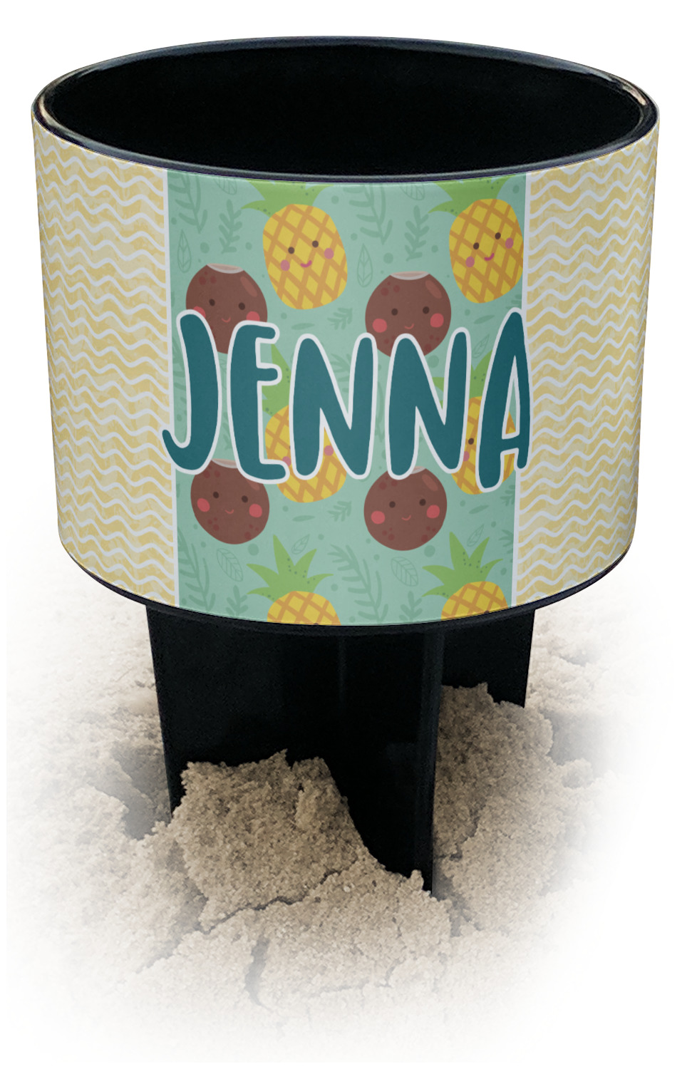 This cup holder has a large stake at its bottom that anchors it to the sand or ground below, while the cup holder rests above the stake. The entire drink holder is made of durable plastic and displays your customization around the cup holder portion. We sell these personalized beach spikers in two different colors: black and white.