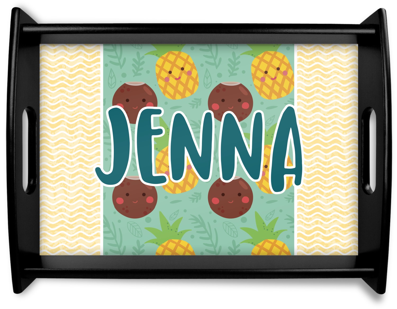 This serving tray with handles features square edges and two rounded sides, creating a very modern look. Each side is fabricated from a beautifully cut, natural wood. The bottom of the interior of the tray displays your customized design in bright, vibrant color. The tray is sold in both a black color and a natural wood look. Each variation of the wood serving tray has two sizes: Small, which is 14" x 10" x 2.25", and Large, which is 19.5" x 13.5" x 2.75".