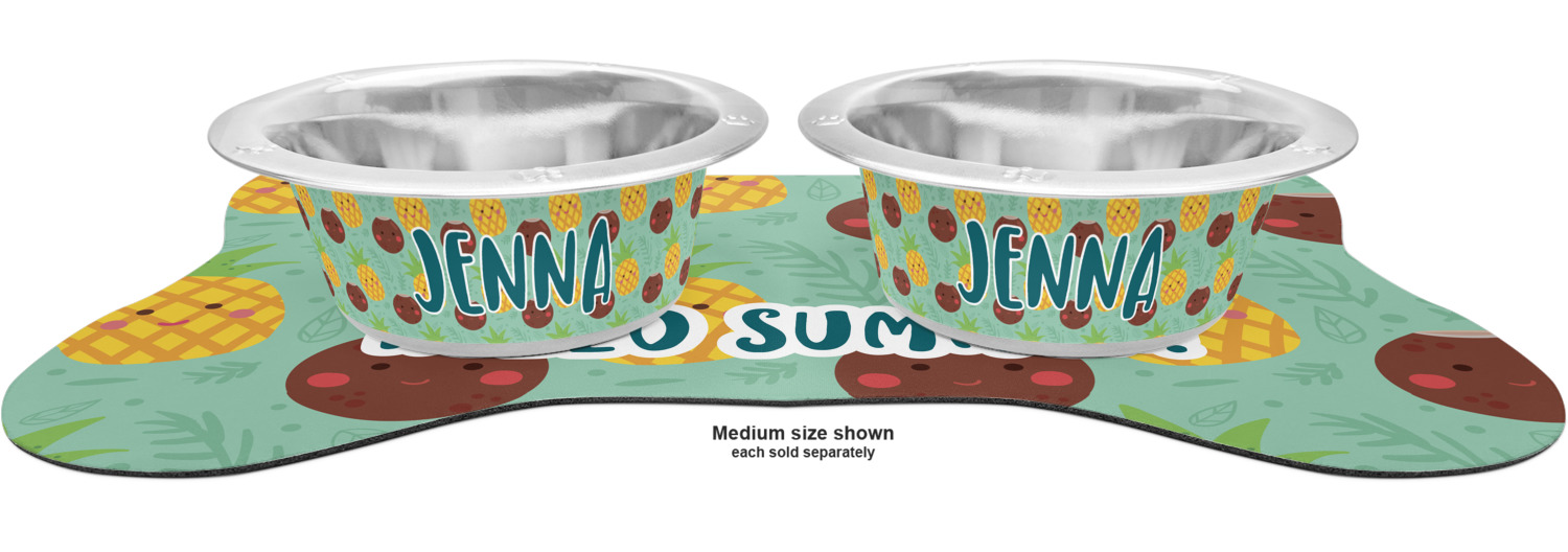 The top of this mat displays your custom design, as it is printed on polyester. To prevent slippage, the underside of the mat is made of rubber. We offer a small dog food mat, suitable for smaller dogs and a large dog food mat for bigger breeds. The small dog food mat is approximately 19 by 13 inches, while the large dog feeding mat measures at approximately 26.75 by 18 inches. Both personalized mats are ideally sized to fit two dog bowls.