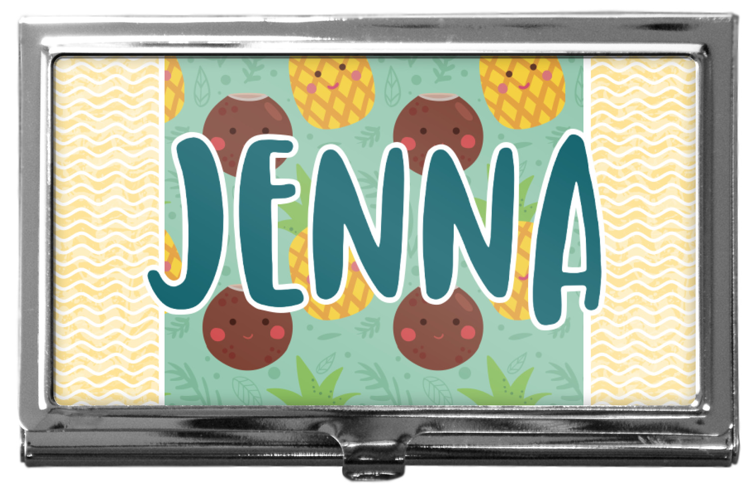 This design is filled with happy coconuts and pineapples to brighten your day. A nice teal color is used behind them, while a yellow chevron is used as the secondary pattern.