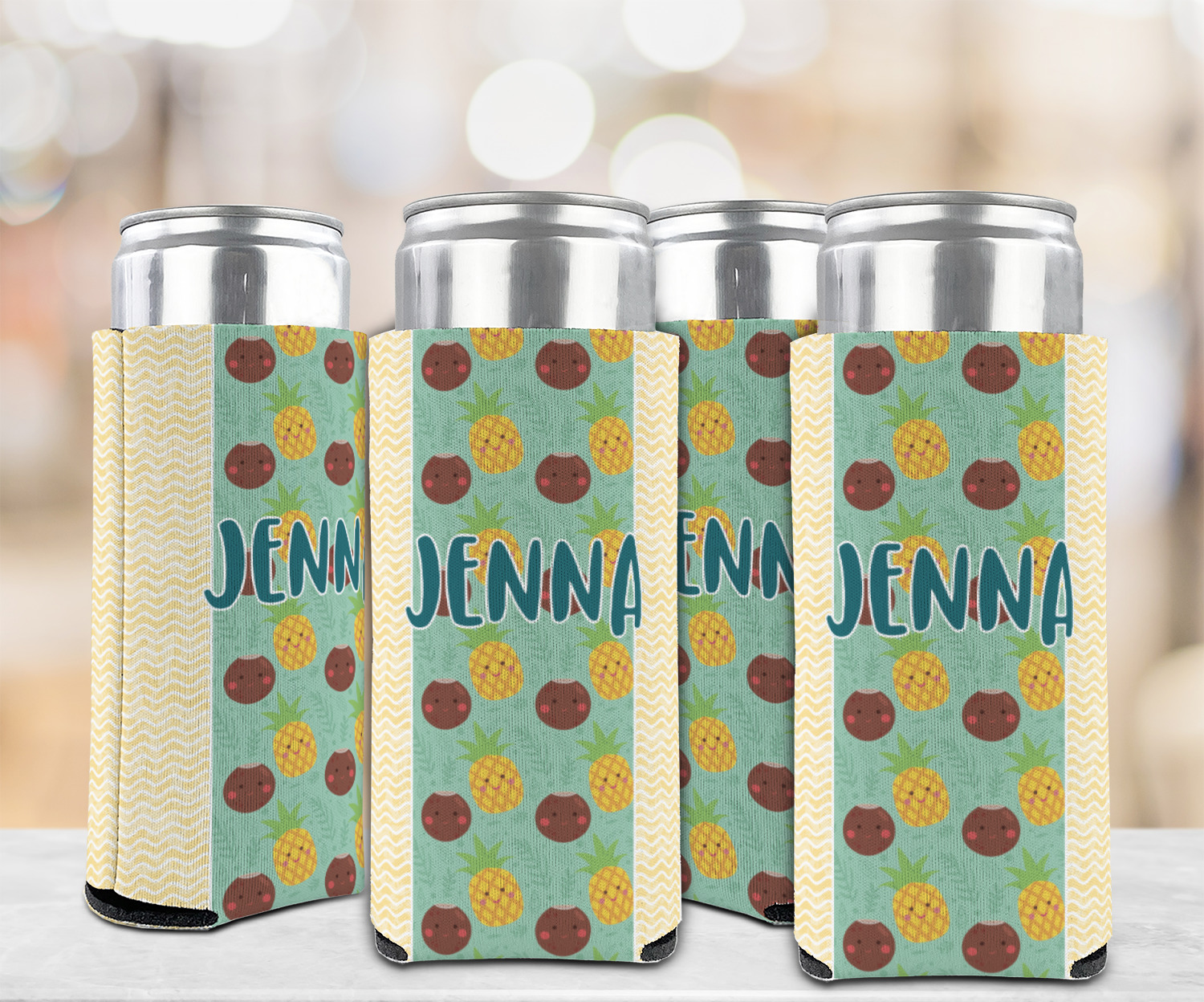 This design is filled with happy coconuts and pineapples to brighten your day. A nice teal color is used behind them, while a yellow chevron is used as the secondary pattern.