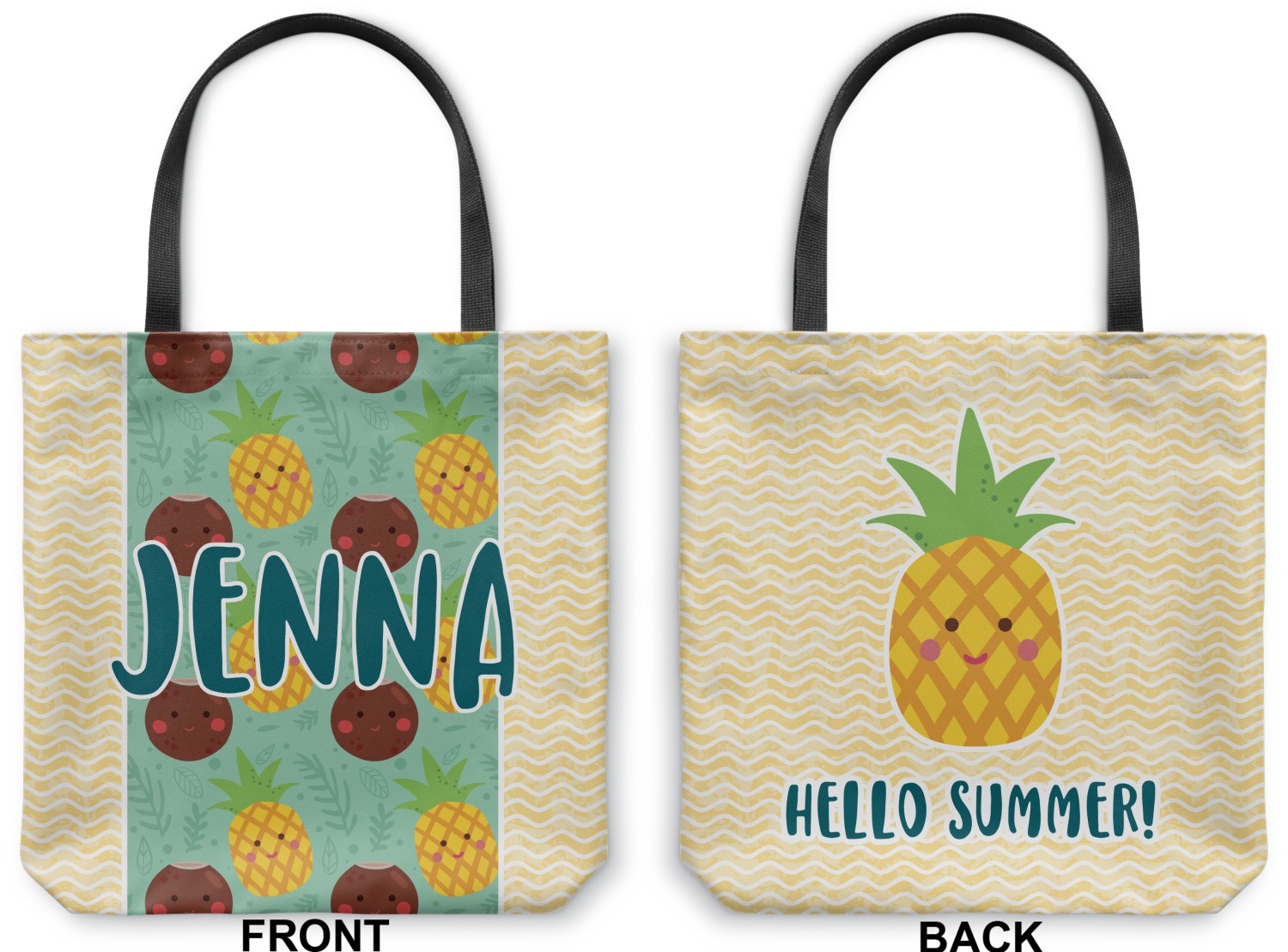 Our totes are made right here in the USA. Your design is printed on canvas fabric; the fabric is then cut and sewn on the sides and on the bottom to add an approximately 3.5 inch gusset. Black cotton handles are sewn in and reinforced. Your tote has a designs on both sides - the designs can be the same or different - the choice is yours. The inside of the tote has a black fused lining.