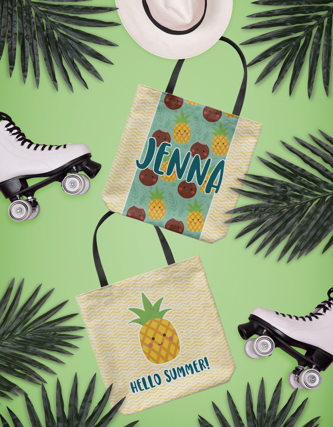 This design is filled with happy coconuts and pineapples to brighten your day. A nice teal color is used behind them, while a yellow chevron is used as the secondary pattern.