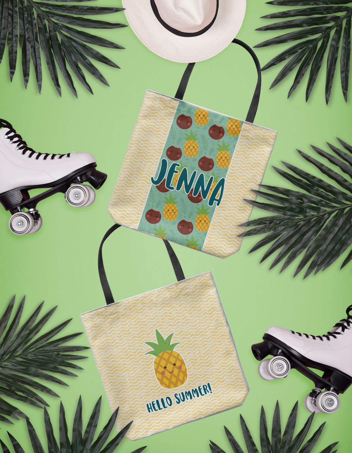 This design is filled with happy coconuts and pineapples to brighten your day. A nice teal color is used behind them, while a yellow chevron is used as the secondary pattern.