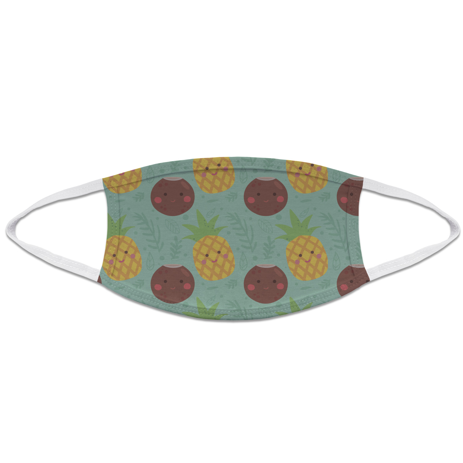 This design is filled with happy coconuts and pineapples to brighten your day. A nice teal color is used behind them, while a yellow chevron is used as the secondary pattern.