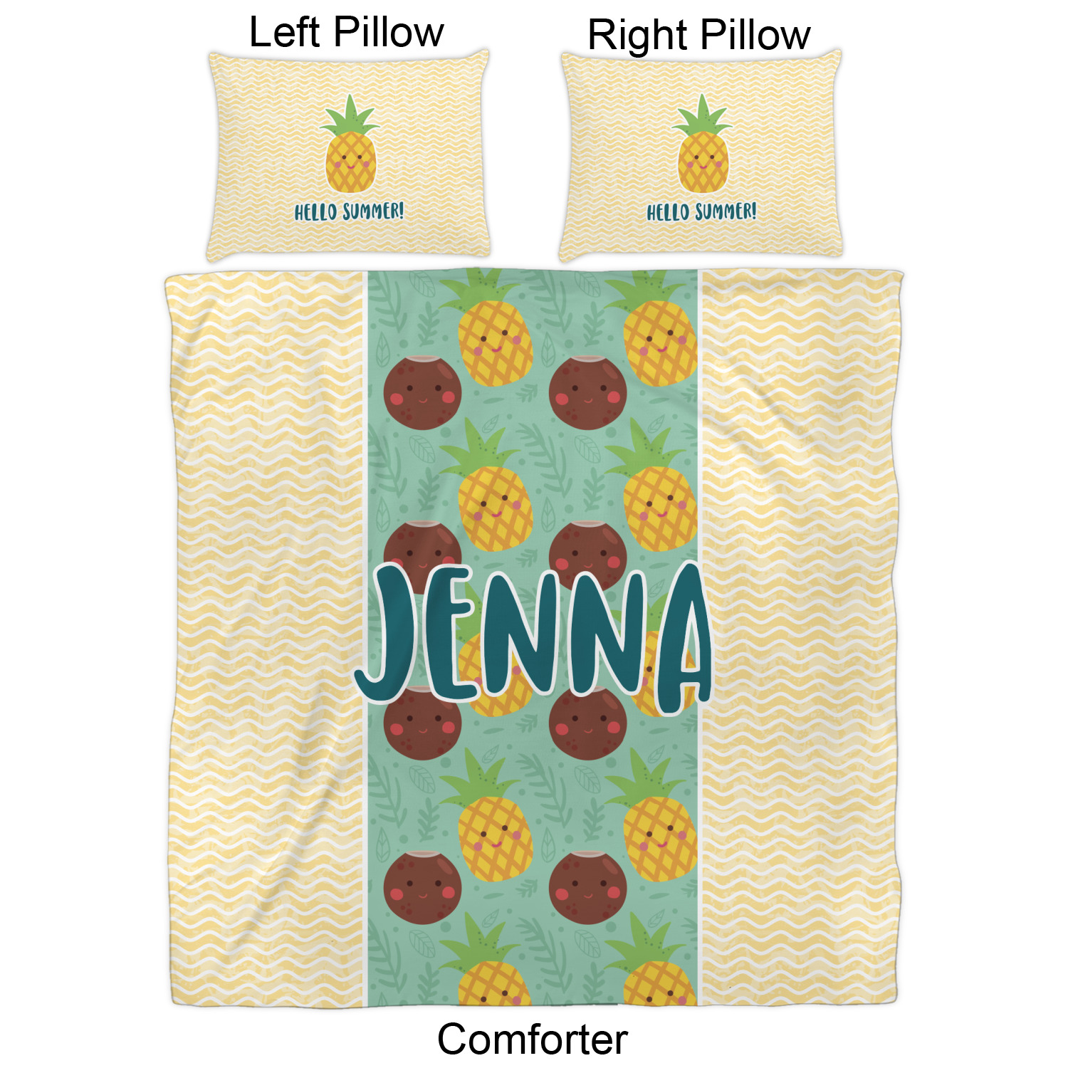 This design is filled with happy coconuts and pineapples to brighten your day. A nice teal color is used behind them, while a yellow chevron is used as the secondary pattern.