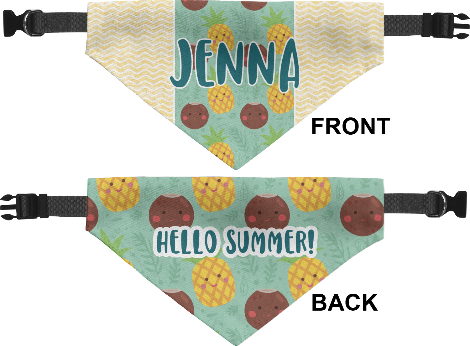 We print the front and back of these dog bandanas with your customized design. The bandana itself is made from a durable polyester, sewn together with a gap large enough to accommodate any collar. Regardless, the bandana includes a plain black, canvas collar with plastic snaps, that can easily be removed if desired. These dog bandana collars are available in four sizes: small, medium, large, and extra large. Please see our sizing chart for more information regarding the dimensions of each size.