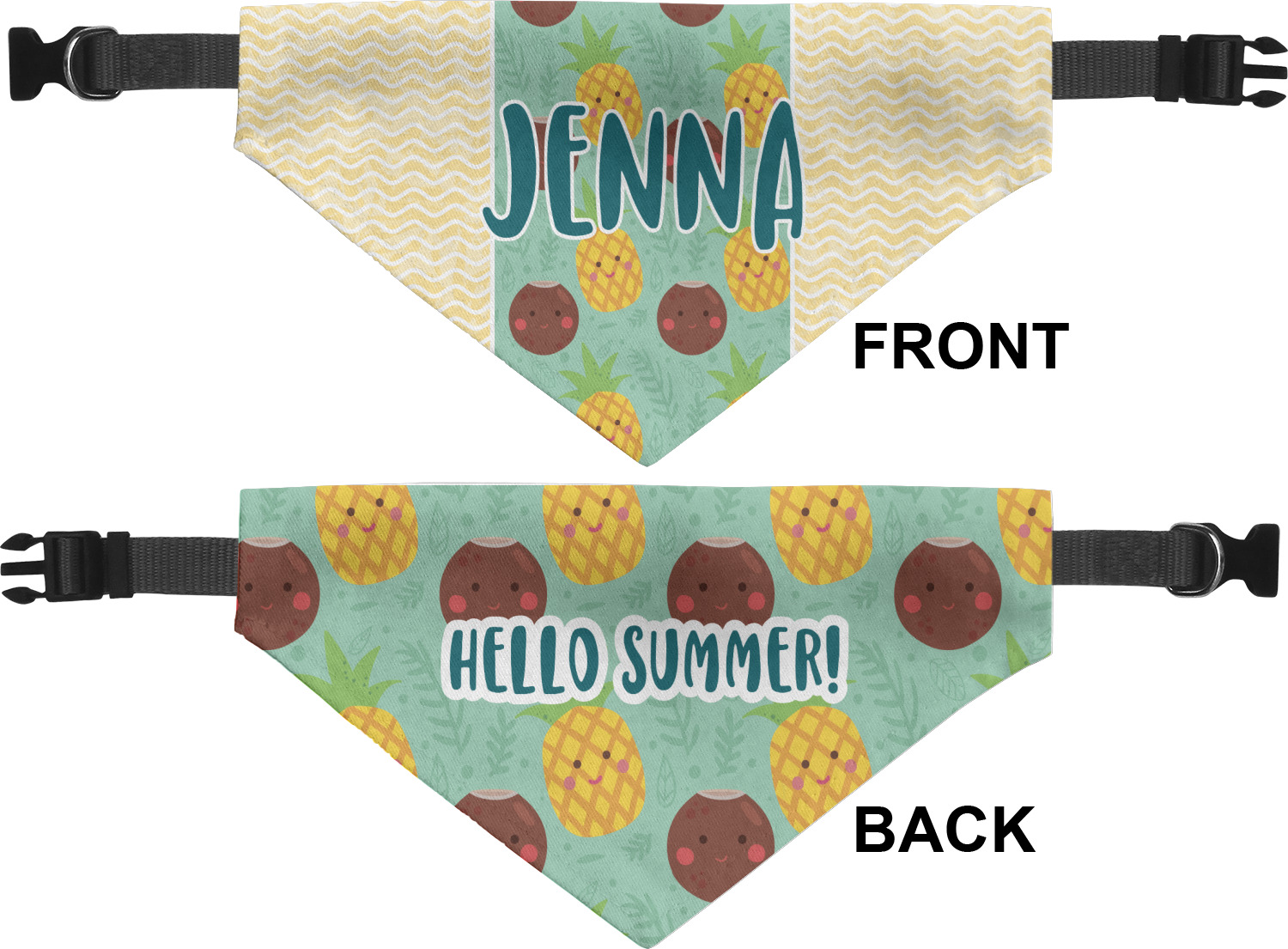We print the front and back of these dog bandanas with your customized design. The bandana itself is made from a durable polyester, sewn together with a gap large enough to accommodate any collar. Regardless, the bandana includes a plain black, canvas collar with plastic snaps, that can easily be removed if desired. These dog bandana collars are available in four sizes: small, medium, large, and extra large. Please see our sizing chart for more information regarding the dimensions of each size.