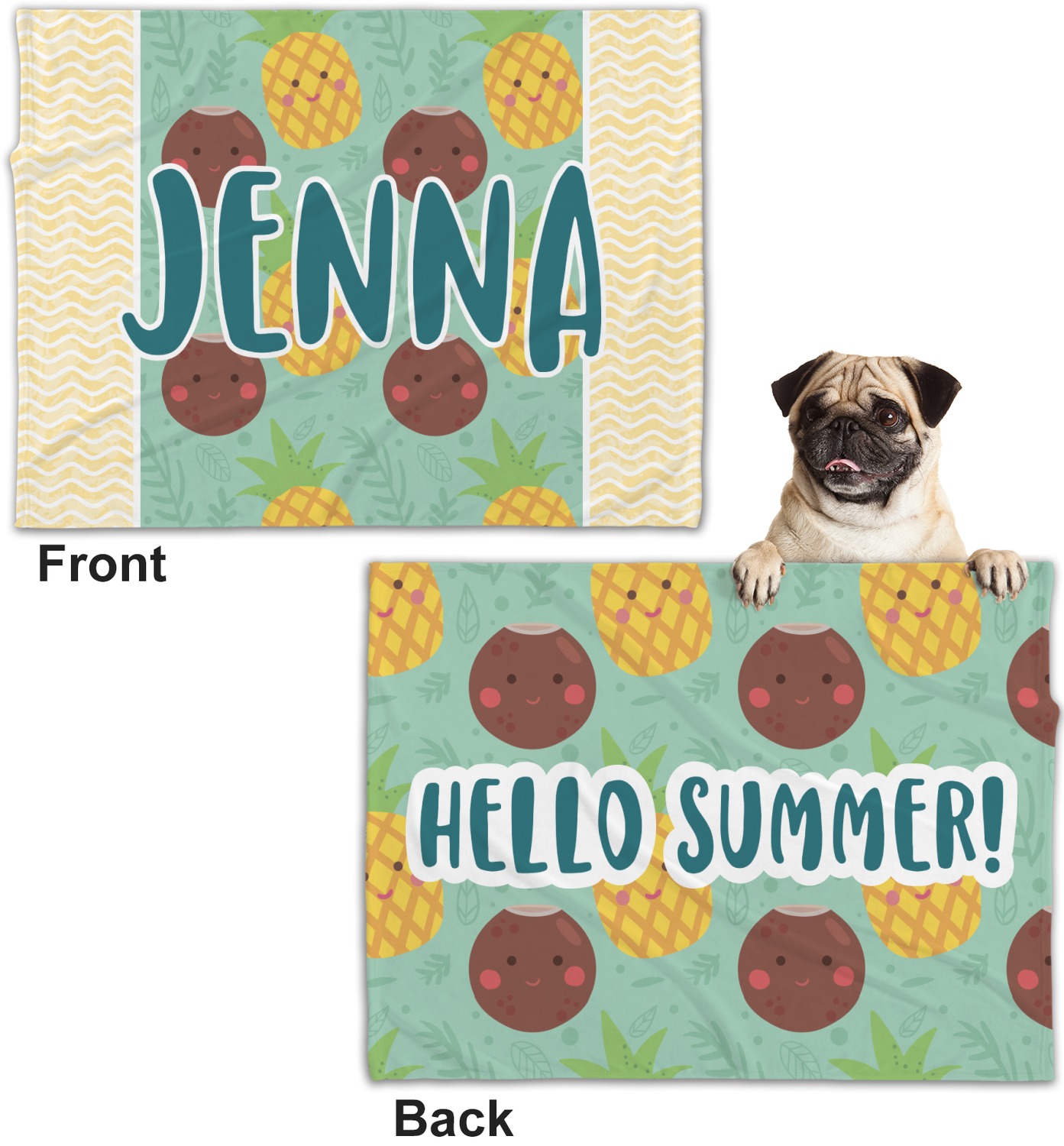 These dog blankets are crafted from a gentle, soft-to-the-touch, minky material. We print your customizations, either matching or differing, on both the top and underside of the blanket. These personalized dog blankets are available in two sizes: regular and large. Our regular size, at 40" x 30", accommodates small and some medium size dogs. At 60" x 50", our large dog blanket is a better fit for bigger breeds. Though specialized for dogs, these blankets still make a thoughtful gift for your favorite feline, or any other pet in mind!