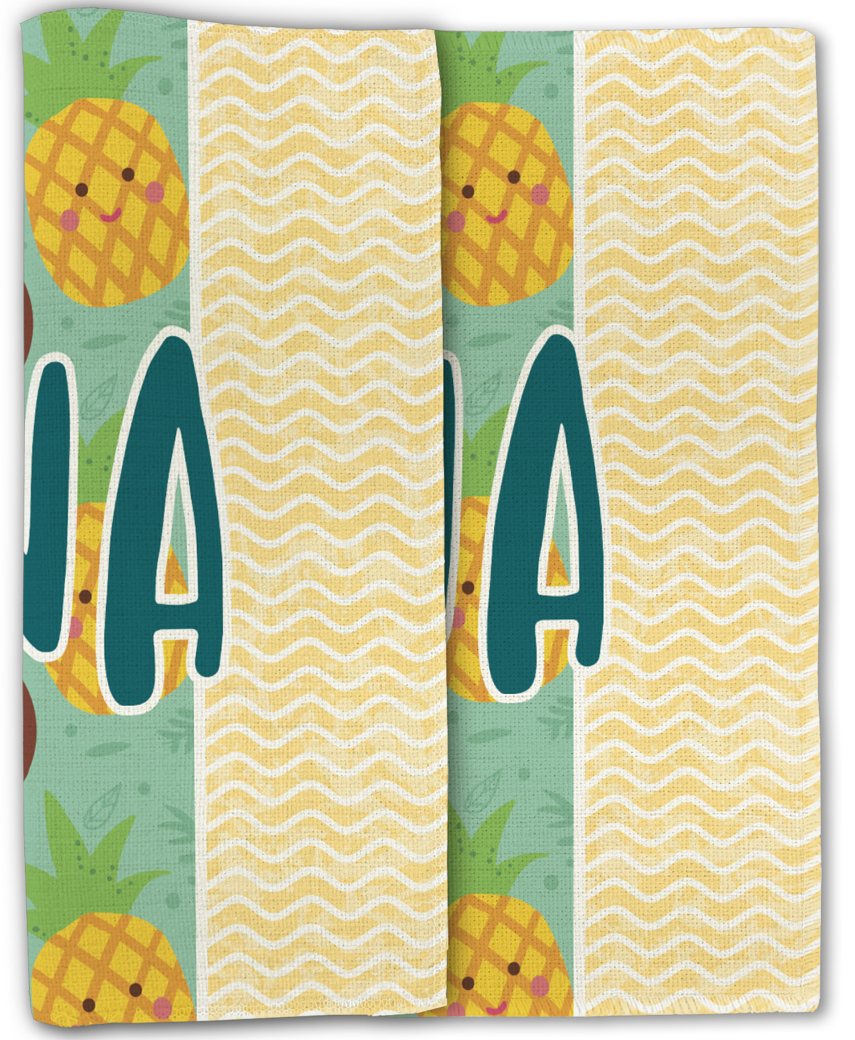 This design is filled with happy coconuts and pineapples to brighten your day. A nice teal color is used behind them, while a yellow chevron is used as the secondary pattern.