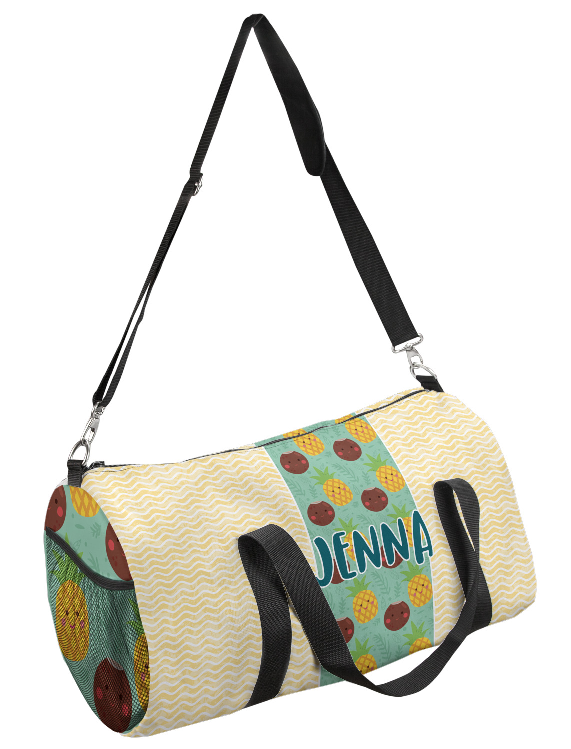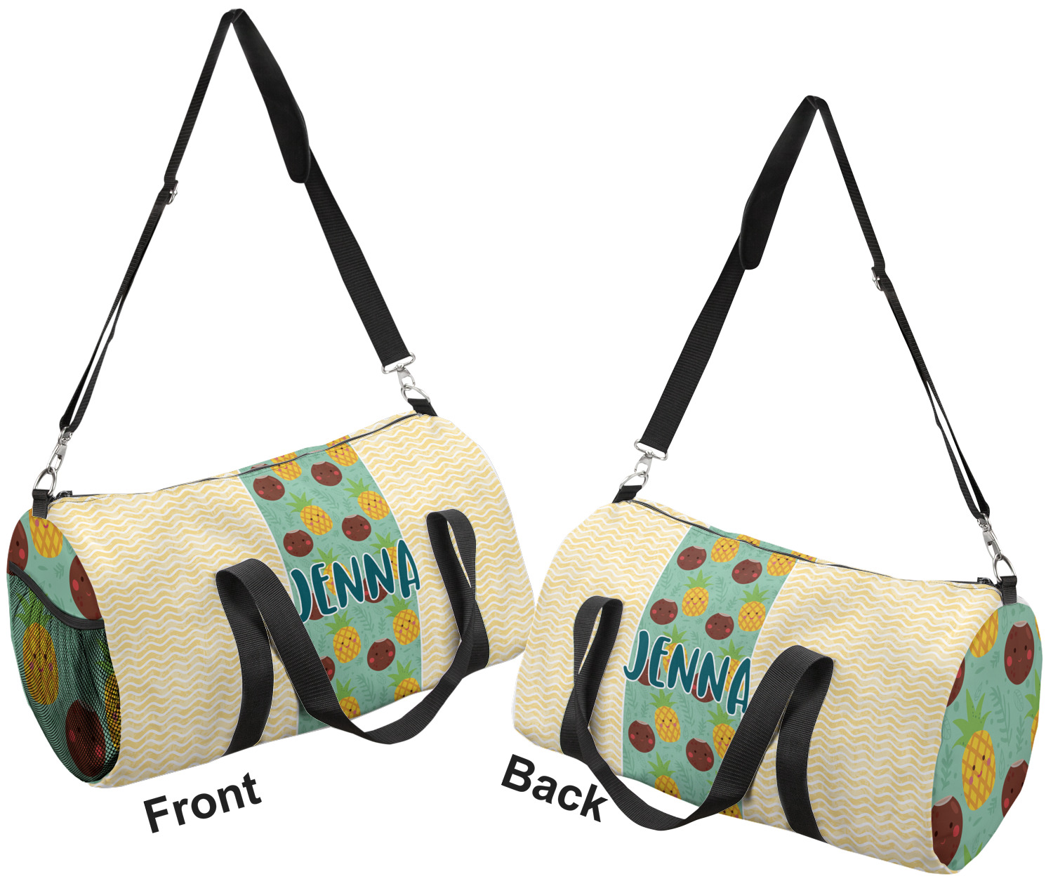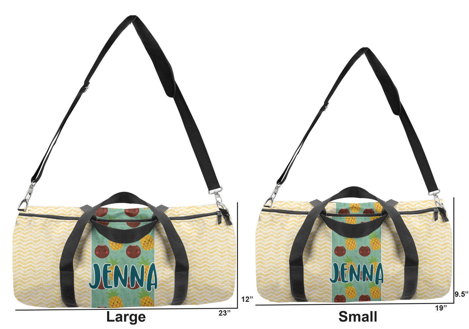 This duffle is a sturdy bag made of a canvas material. It comes in two sizes: Small (19"W x 9.5"H x 9.5"D) and Large (23"W x 12"H x 12"D). The bag is a cylindrical shape with a black adjustable strap and two handles. On one side is an elastic pouch to put a waterbottle or other small item. Your product will be sublimated with your design and is able to be designed on the front, back, and sides. Be sure to remember that the straps may cut into parts of your design if you upload your own artwork.
