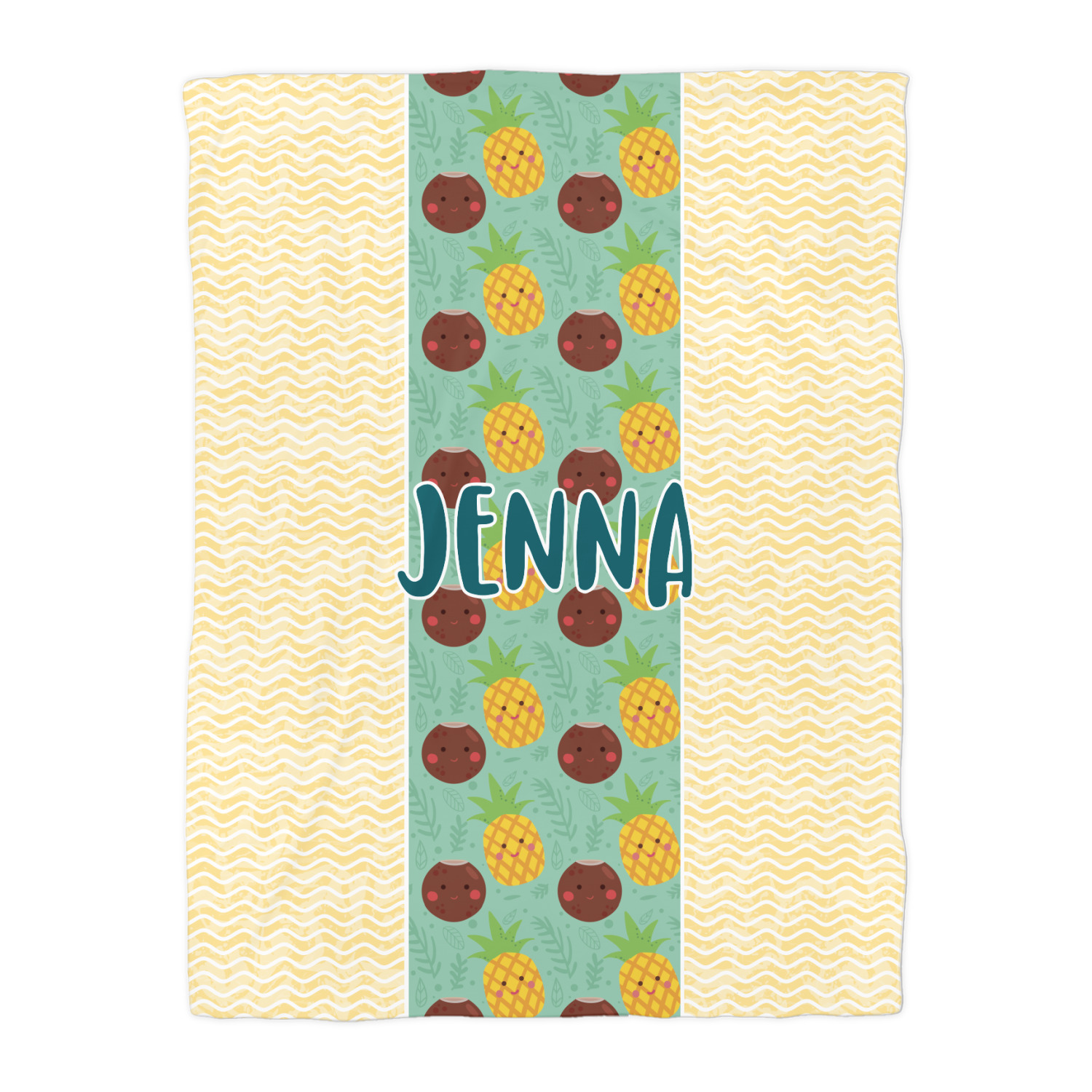 This design is filled with happy coconuts and pineapples to brighten your day. A nice teal color is used behind them, while a yellow chevron is used as the secondary pattern.