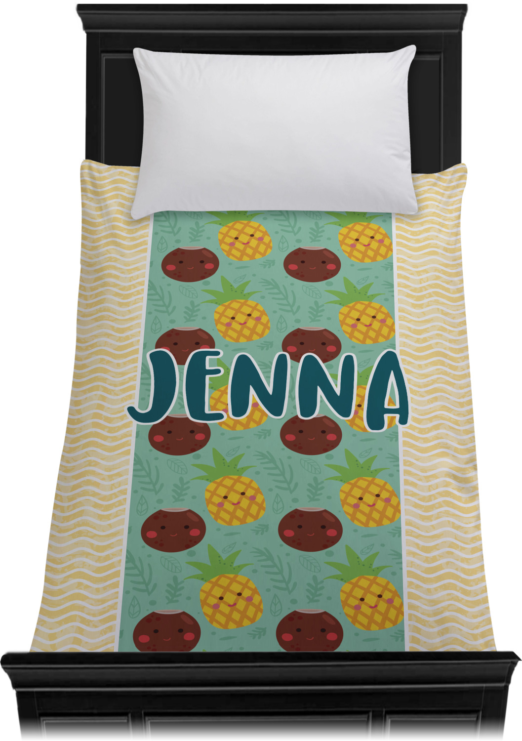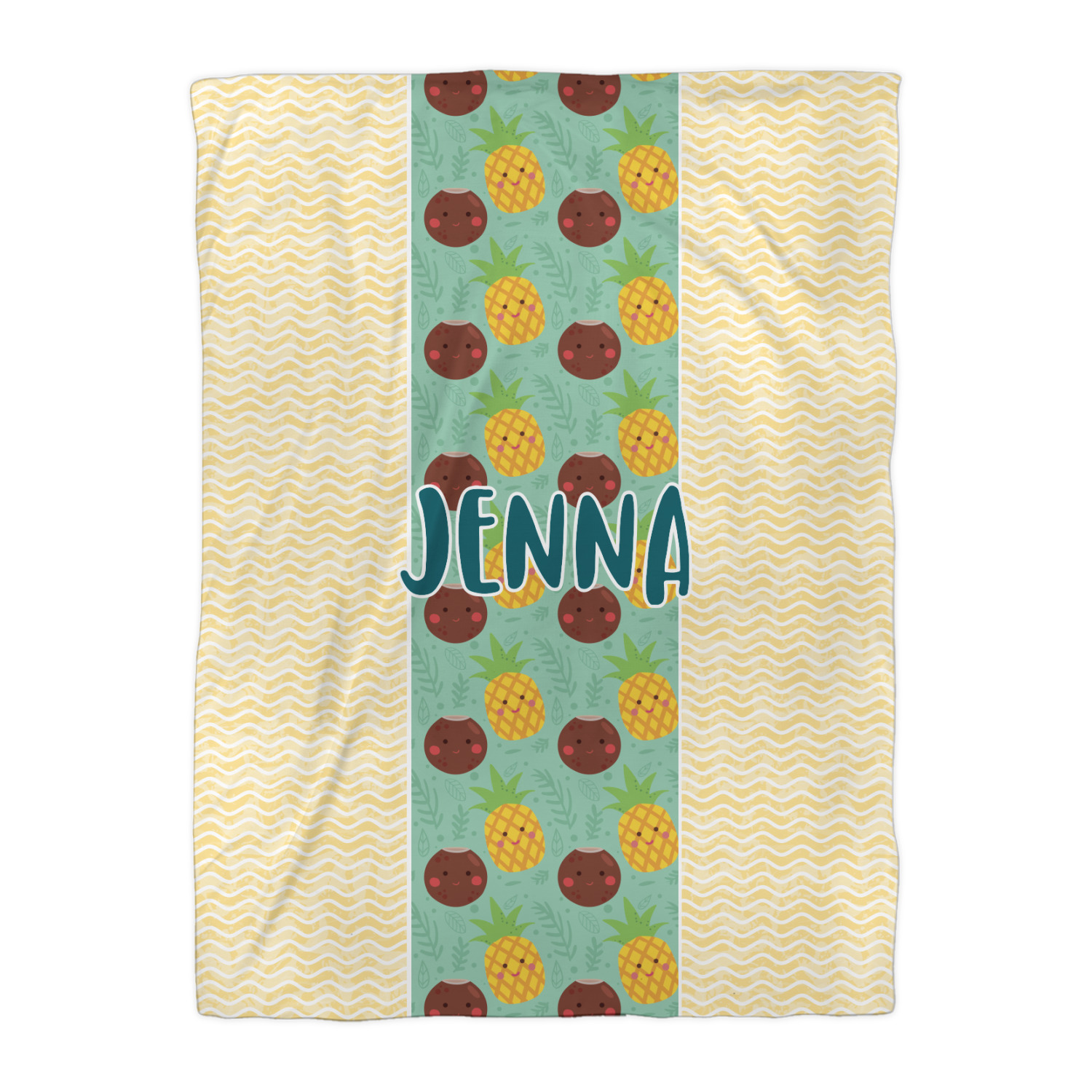 This design is filled with happy coconuts and pineapples to brighten your day. A nice teal color is used behind them, while a yellow chevron is used as the secondary pattern.