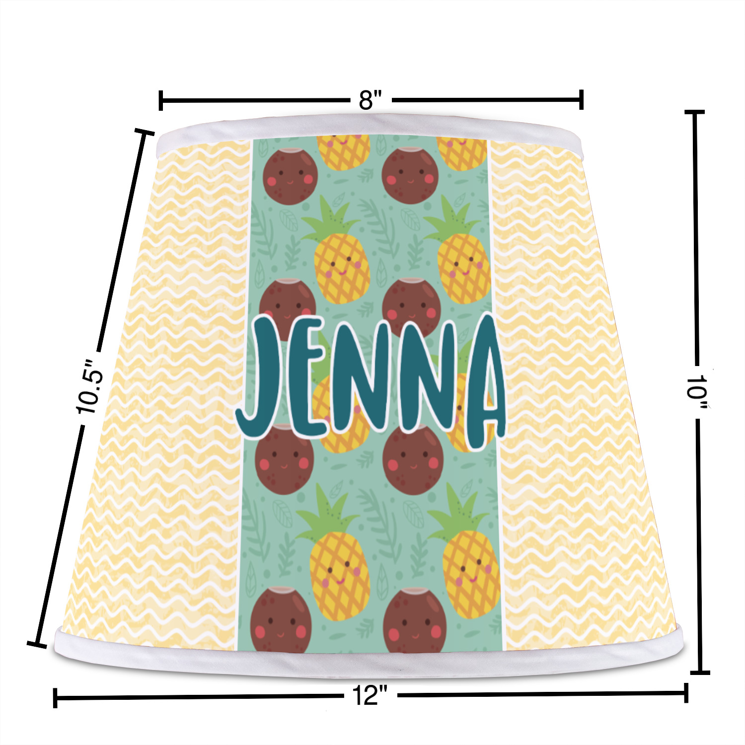 The base of this lampshade is 12 inches in diameter, and the top spans 8 inches in diameter. The total height of the lampshade is 10 inches. The angled nature of this custom lampshade concentrates the light, making it ideal for smaller spaces. This lampshade is made of matte, polyfilm, and displays your customization in its middle. The top and bottom of this colorful lamp shade are lined with a white fabric ribbon (which can be replaced with black inside the design studio) which frames your design and creates a sophisticated finish. As an UNO fitter lampshade, this unique lamp shade will fit a variety of bases.
