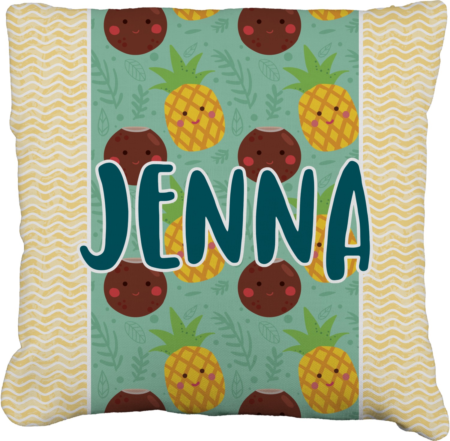 This design is filled with happy coconuts and pineapples to brighten your day. A nice teal color is used behind them, while a yellow chevron is used as the secondary pattern.