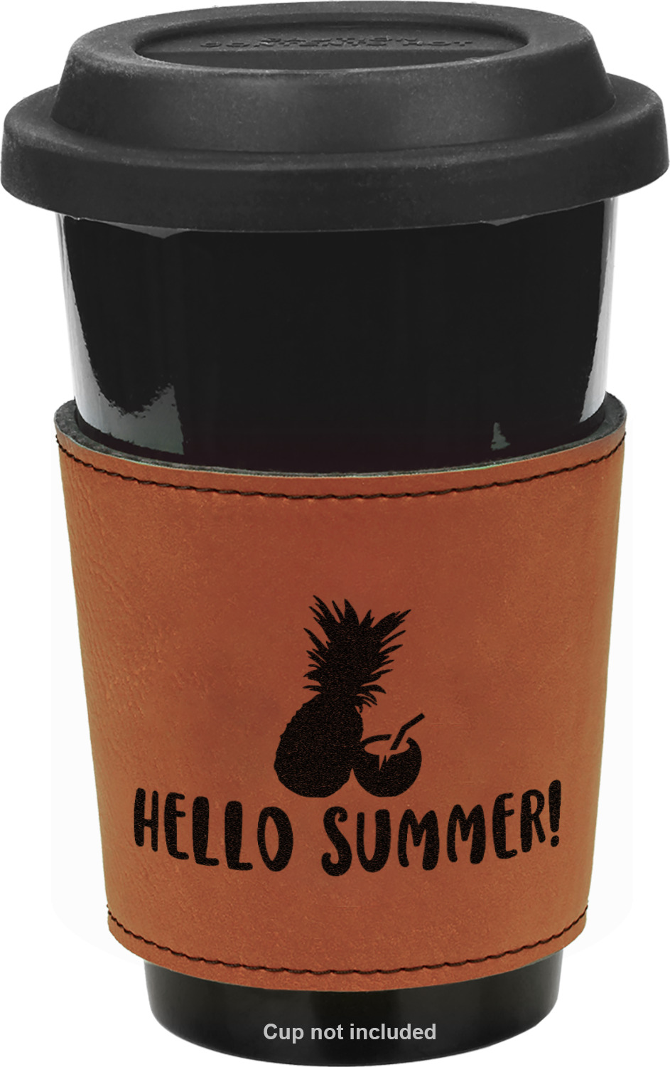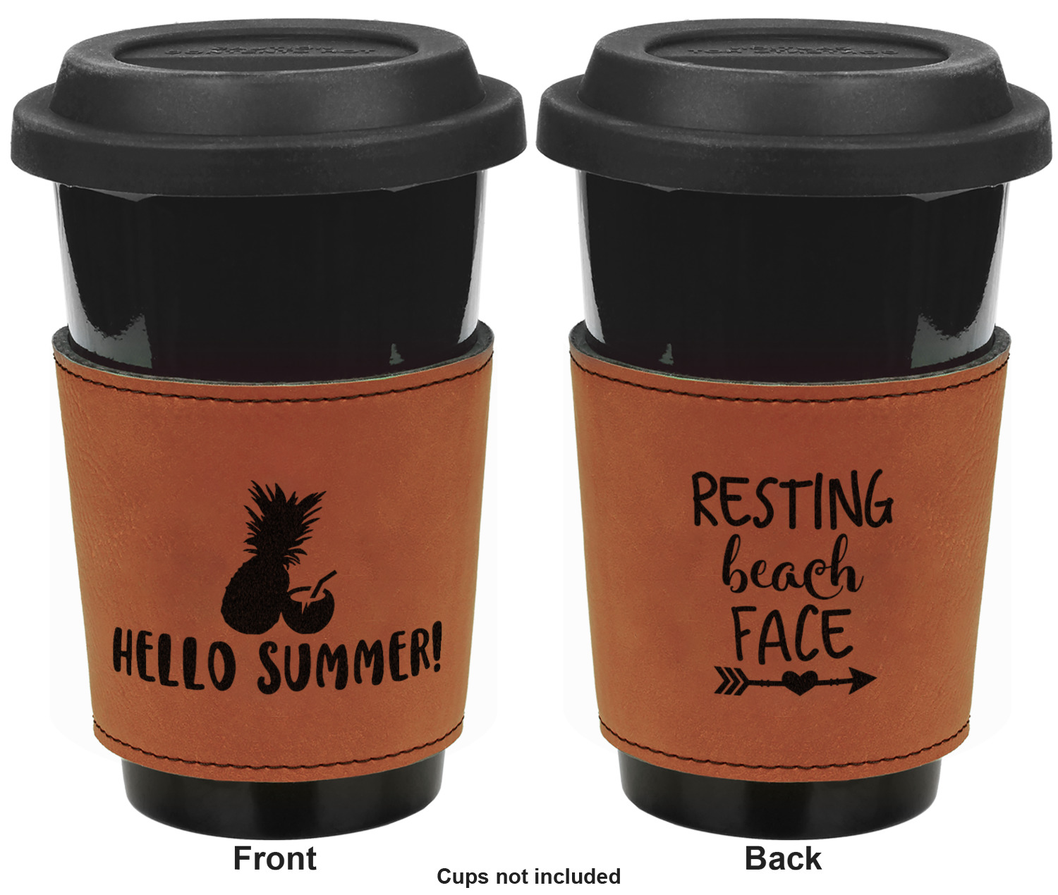 This cup sleeve is made from a suave, cognac-brown leatherette and finished with an intricate, black stitch. The interior of this can sleeve is fabricated from a thin foam material to help insulate your mug's contents. The sleeve is specifically made to suit tapered glasses or mugs, so the top's diameter is 3.5 inches, while the bottom's diameter is 2.75 inches. Your customized design will be laser engraved into the leatherette, leaving behind crisp, black imprint. With these products, we provide you with the option of engraving the front and back, or the front only.