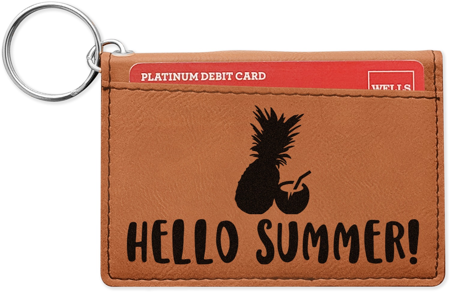 These ID wallet keychains features three pockets on the inside to accommodate your ID and your most frequently used cards. Another pocket occupies the front of the wallet's exterior, and can hold some cash or another card. The wallet is accompanied by a thick metal ring for easy attachment to a belt clip or purse. Each card holder keychain measures at 4.25 by 3 inches and is a beautiful, cognac, medium-brown shade. The personalized monogram, font, or graphic of your choosing is laser engraved into the surface of the wallet, creating a black imprint. We sell these ID wallets in two models: single sided and double sided engraving.