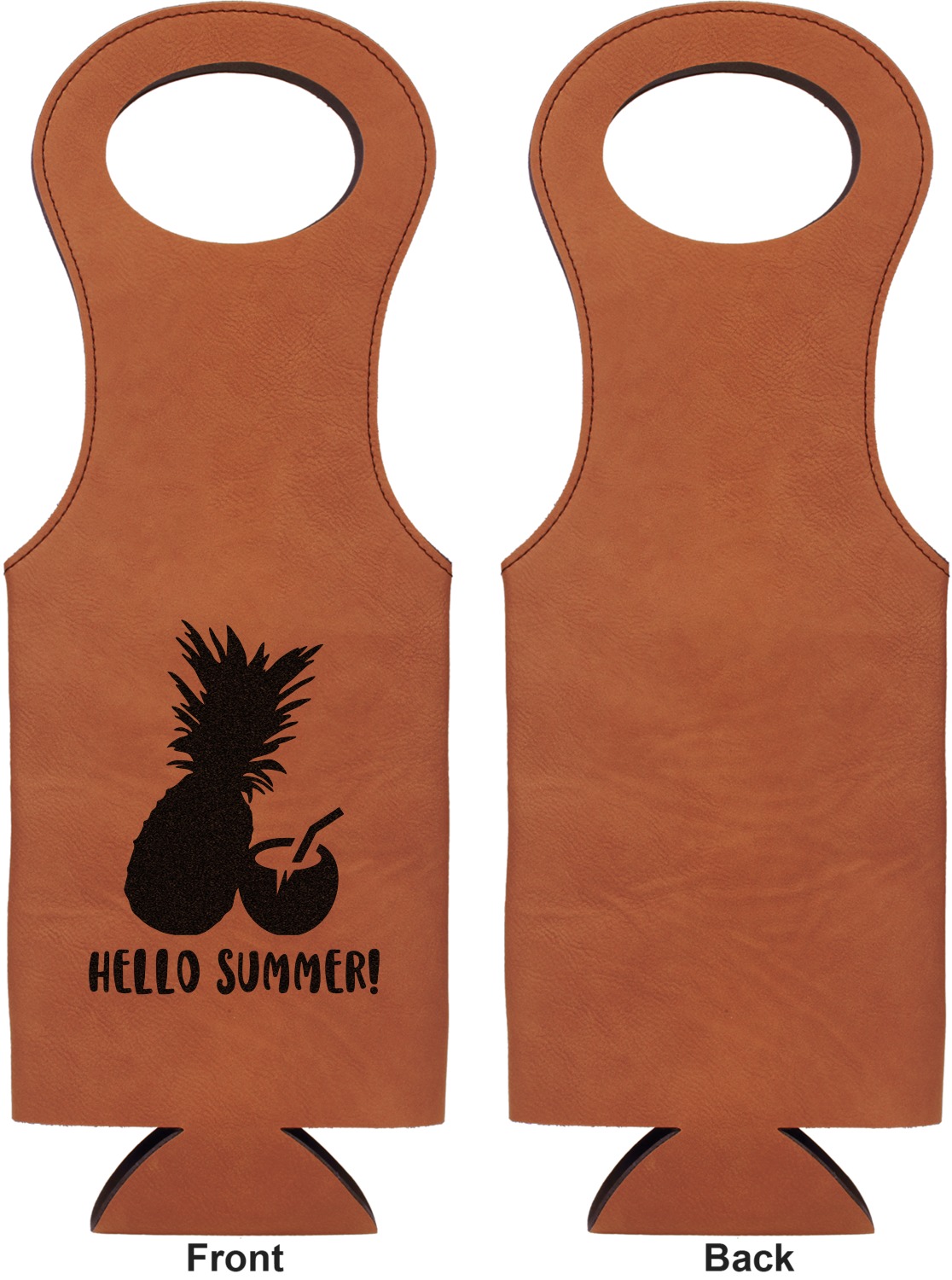 This wine carrier is made from a stunning leatherette, in a cognac-brown color. Strong, black stitching lines the sides of your wine bottle bag and provides extra durability. The interior is lined with a padded, black material to allow for a snug fit once your bottle is placed inside. At the top of this wine gift bag, you'll find two oval shaped handles that elegantly complements the rest of the bag's style. We provide you with the option of laser-engraving the front, or the front and back of your new personalized wine bag!