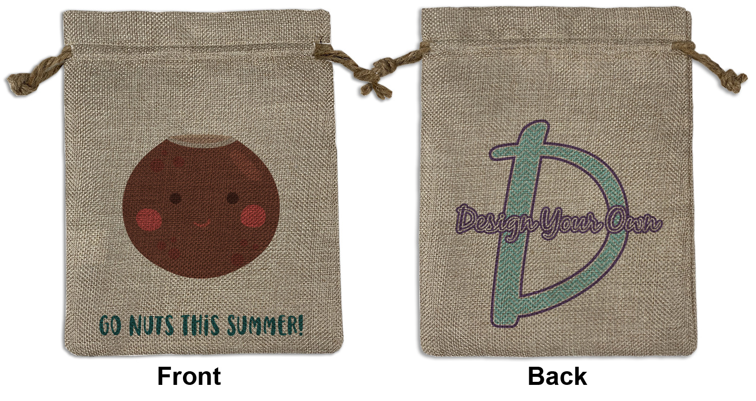 We sell our Burlap Gift Bags in 3 variant sized bags. Made with burlap polyester, each personalized bag can be secured with a twine drawstring pull. Your custom design is available to print on one side or both sides - completely up to you! The sizes of the bags measure approximately 4.5" x 6.5" for the smallest size, 6.5" x 8.0" for the medium size, and 6.5" x 13.5" for the large-sized bag.