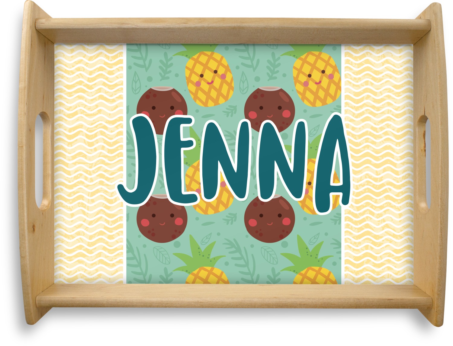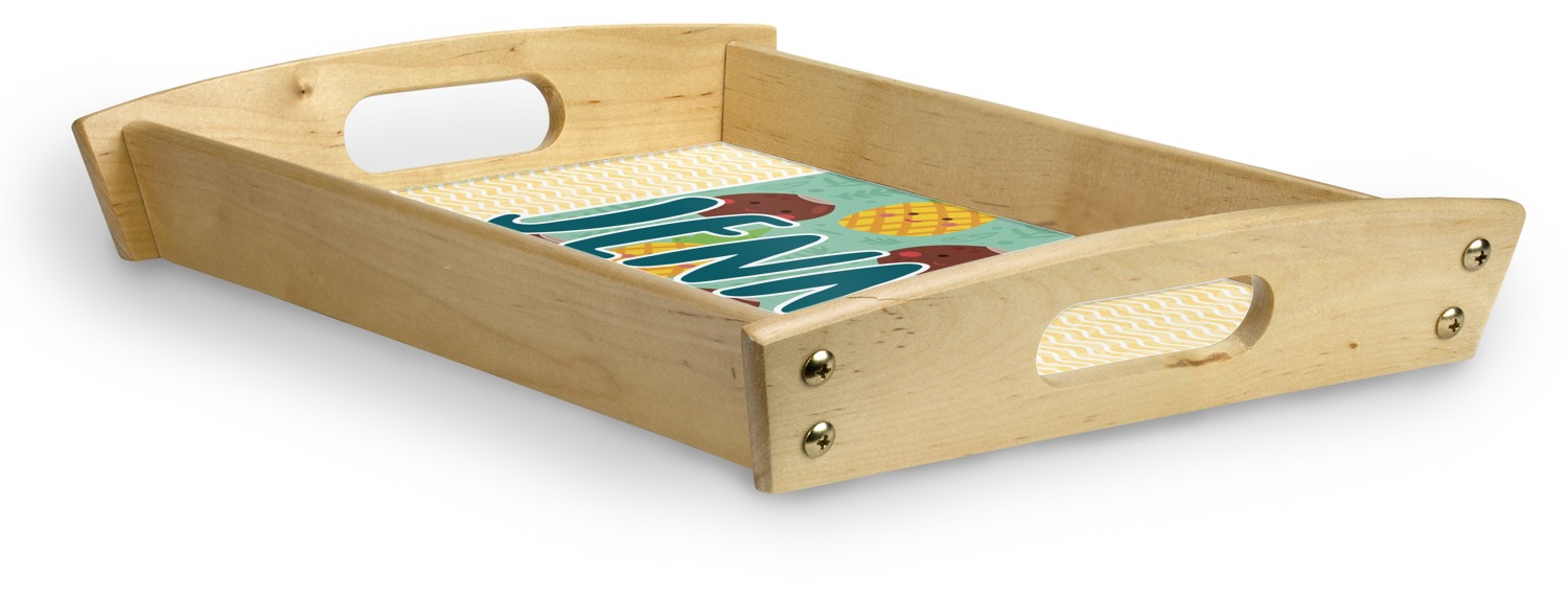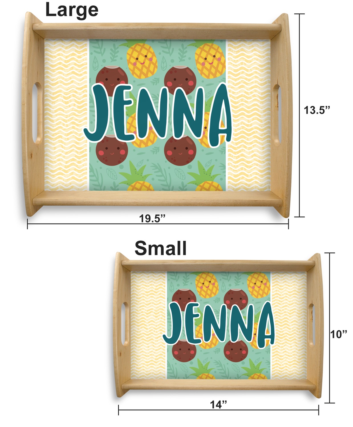 This serving tray with handles features square edges and two rounded sides, creating a very modern look. Each side is fabricated from a beautifully cut, natural wood. The bottom of the interior of the tray displays your customized design in bright, vibrant color. The tray is sold in both a black color and a natural wood look. Each variation of the wood serving tray has two sizes: Small, which is 14" x 10" x 2.25", and Large, which is 19.5" x 13.5" x 2.75".