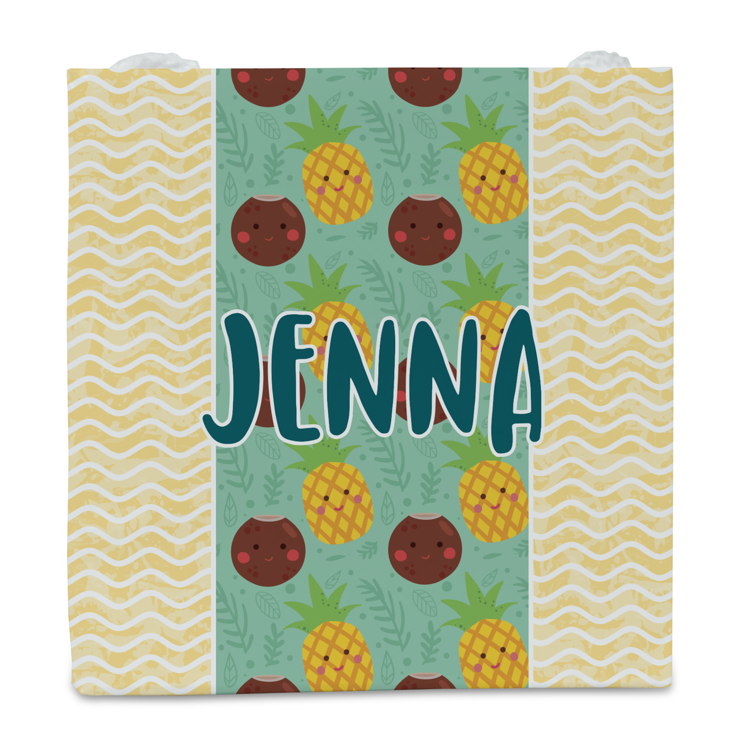 This design is filled with happy coconuts and pineapples to brighten your day. A nice teal color is used behind them, while a yellow chevron is used as the secondary pattern.