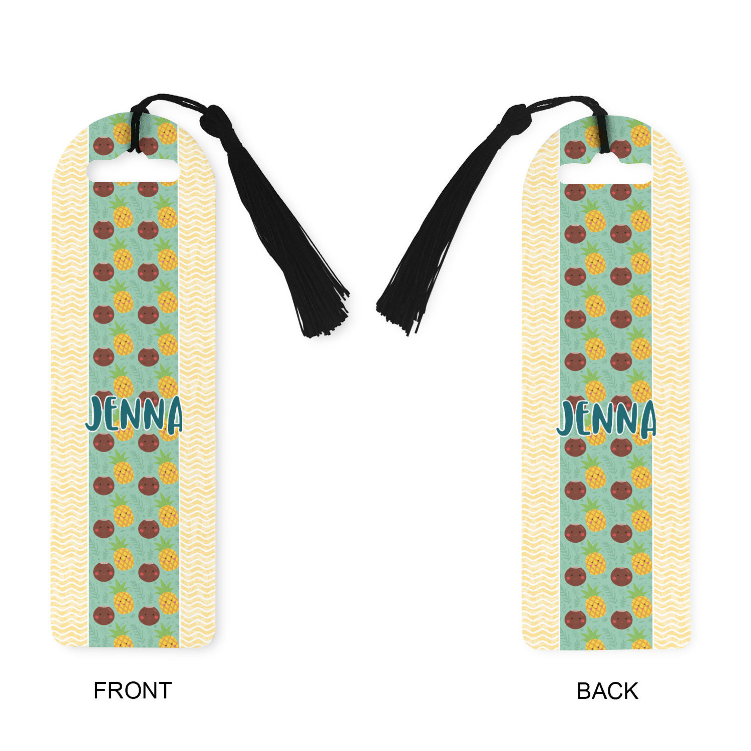 Made from a durable, flexible plastic, these bookmarks are printed with your custom design on them. With the tassel on them they make it easy to find your page in your book. These are a rectangular shape 7 1/4 inches tall with a rounded top and are approximately 2 1/4 inches wide.