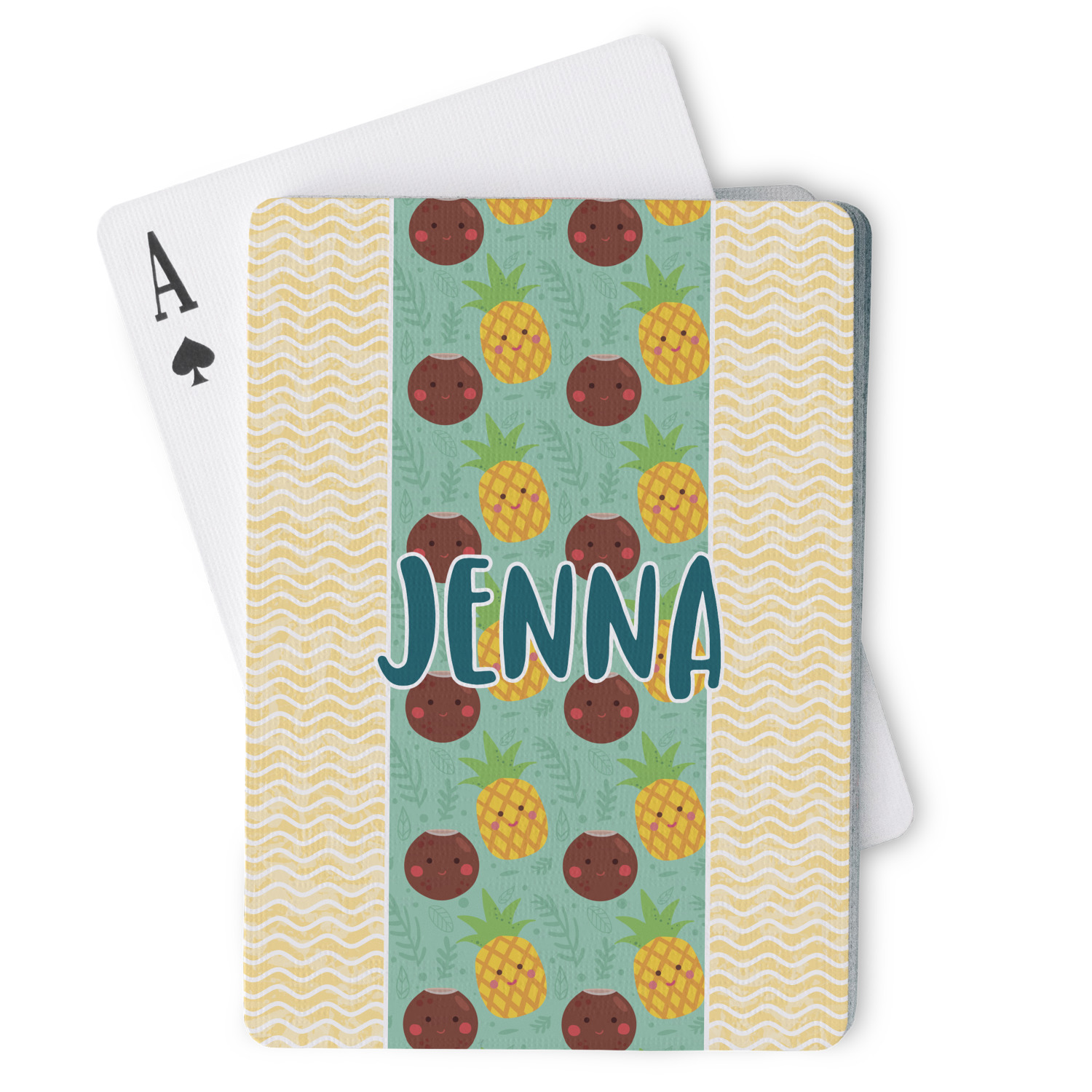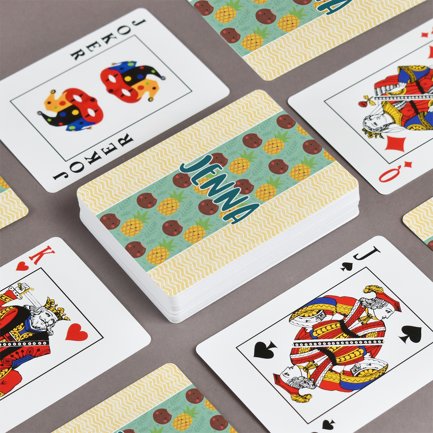 The customization / personalization is printed on the back side. The playing cards have a low gloss coating on both sides. The cards are packaged in a clear plastic box.