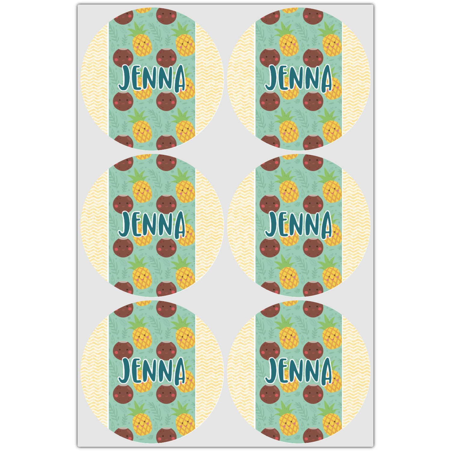This design is filled with happy coconuts and pineapples to brighten your day. A nice teal color is used behind them, while a yellow chevron is used as the secondary pattern.