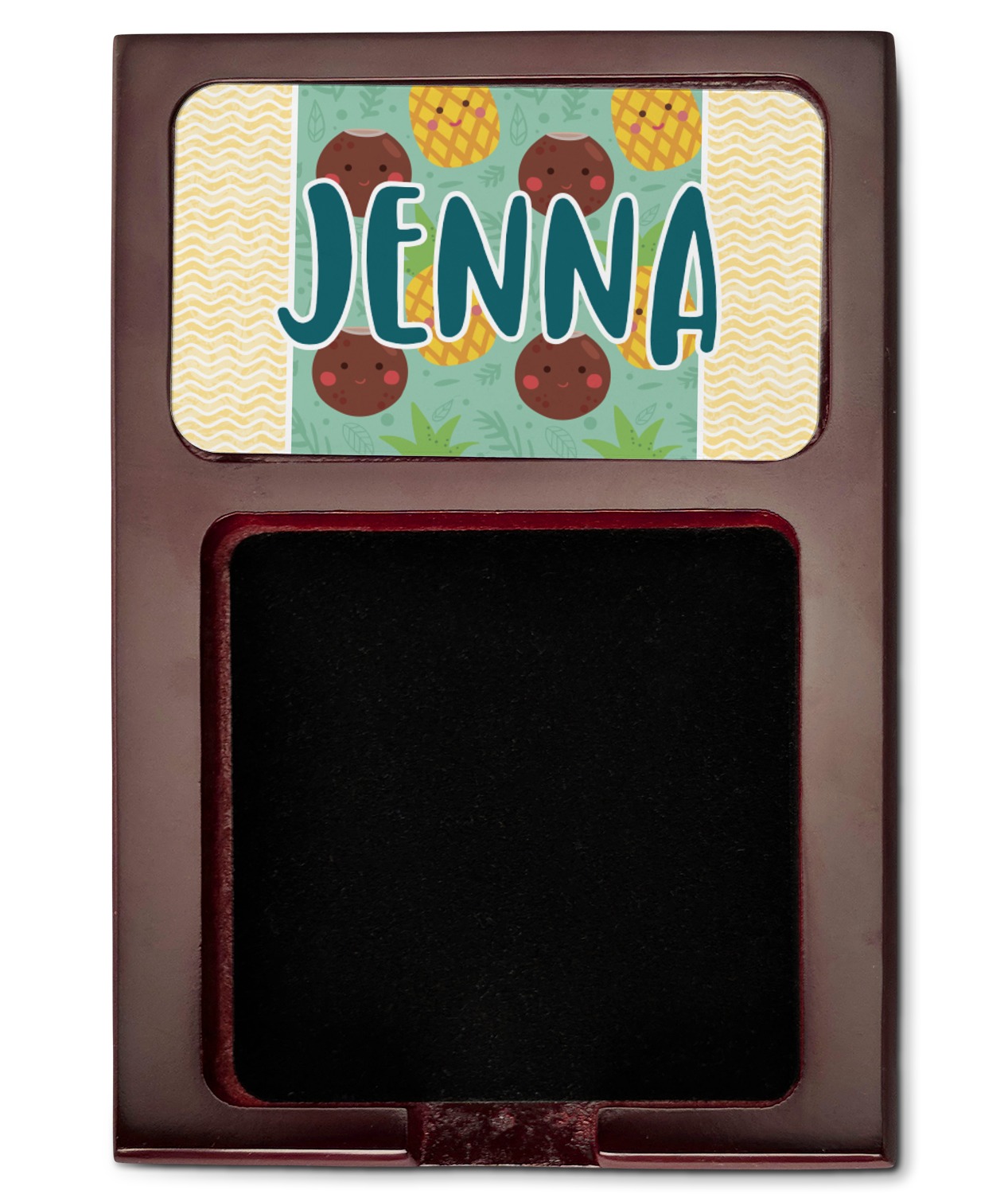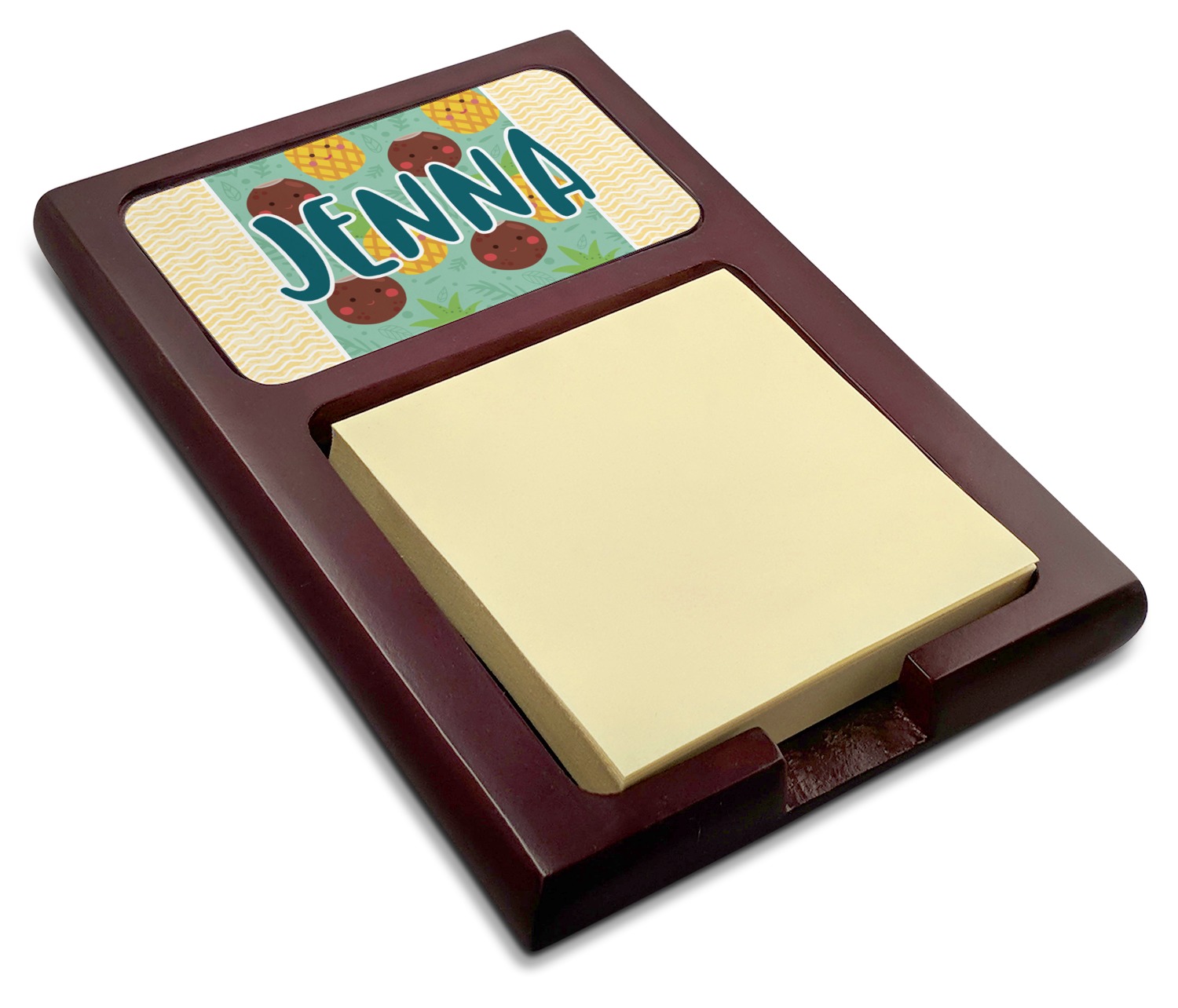 Crafted from a fine mahogany, this post it note holder is in the shade of a dark, cherry color. The dispenser itself is about 4.25 by 6.25 by 0.75 inches. You can place your 3 by 3 inch sticky notes in the indentation below the nameplate. We print your customization onto the nameplate that rests above the velvety indentation.