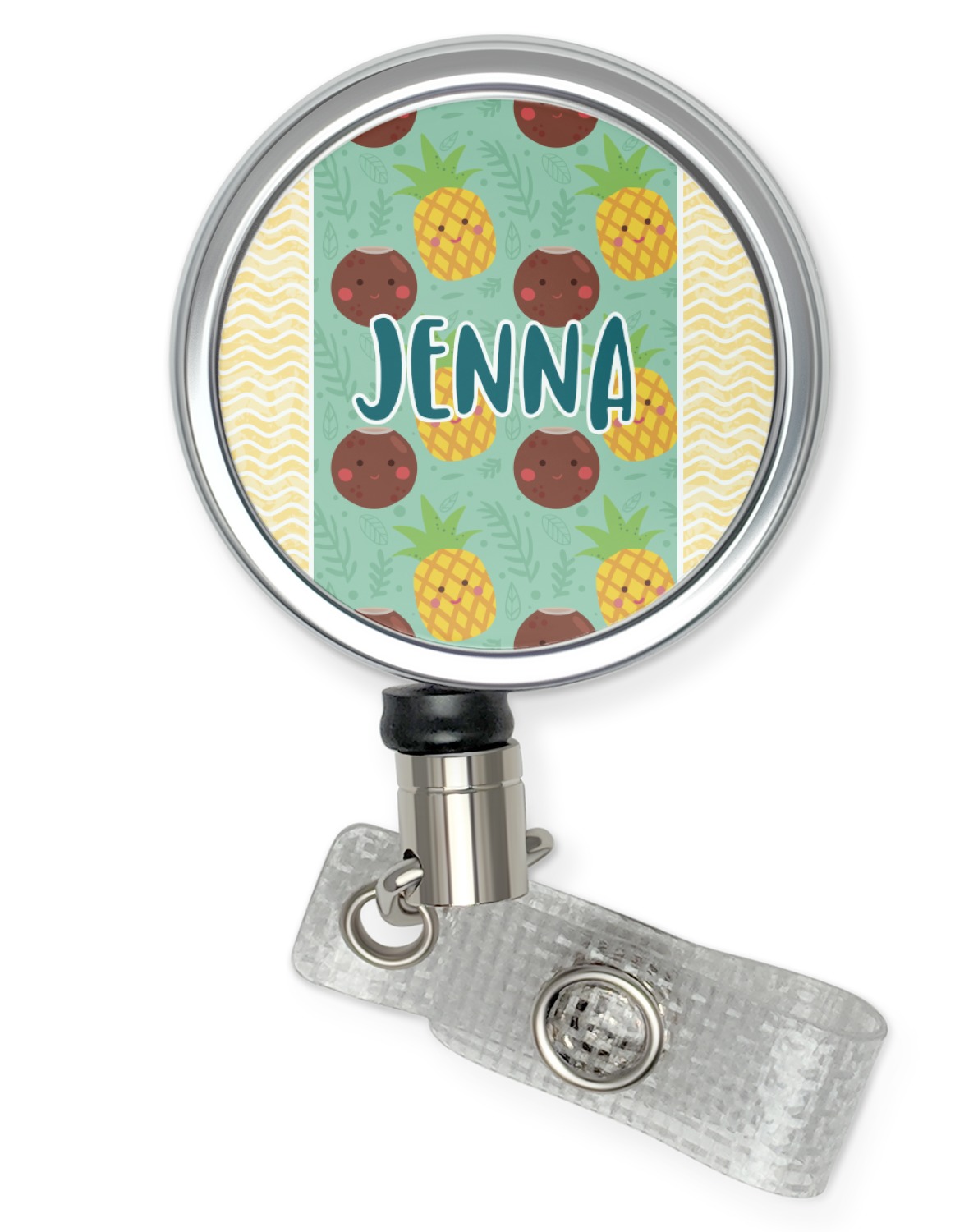 This design is filled with happy coconuts and pineapples to brighten your day. A nice teal color is used behind them, while a yellow chevron is used as the secondary pattern.