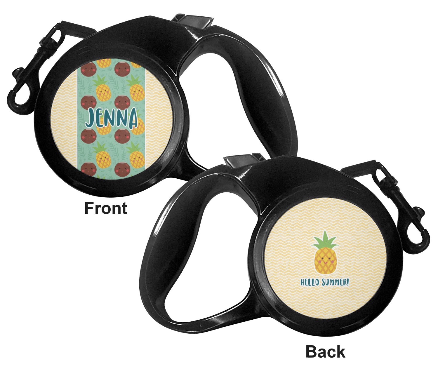 The leash's plastic handle is accommodating of your grip and displays your customization on both sides. The dog leash also features the traditional bolt snap clip, for easy fastening to your dog's collar. The leash and leash handle themselves are both black in color.